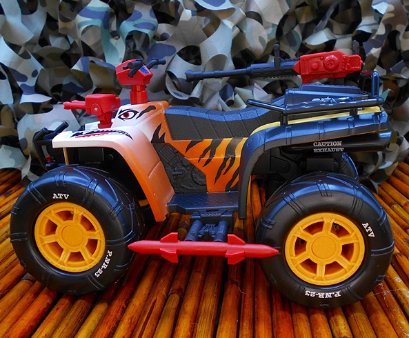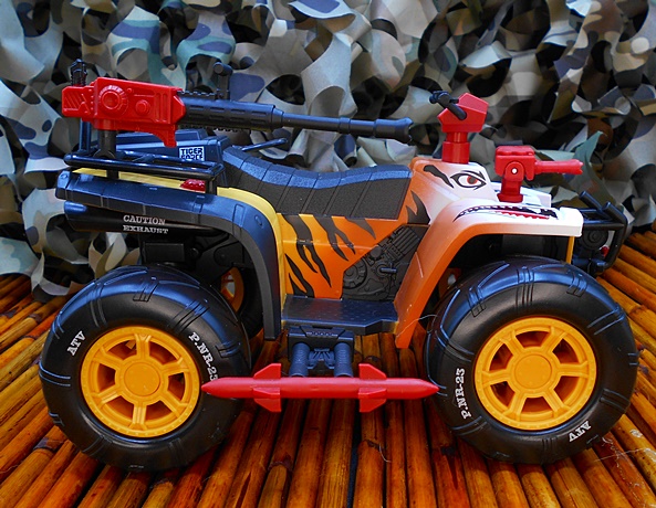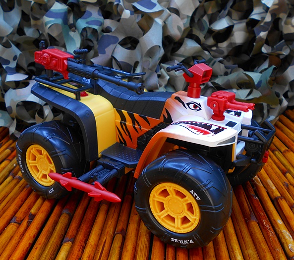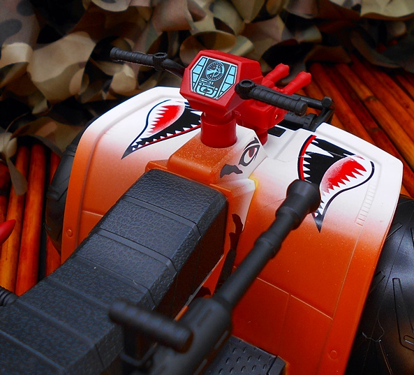 The two bigger weapons include the double-barreled AR design and the SIG 338-style light machine gun. Both of these have been around a bit, but I most recently remember them paired up with Night Force Shockwave. The AR still has the hinged foregrip, but here it’s cast in red plastic, as are the bipod and ammo box on the machine gun. Thematically the red on these weapons should work, but I think it looks kind of cheap.