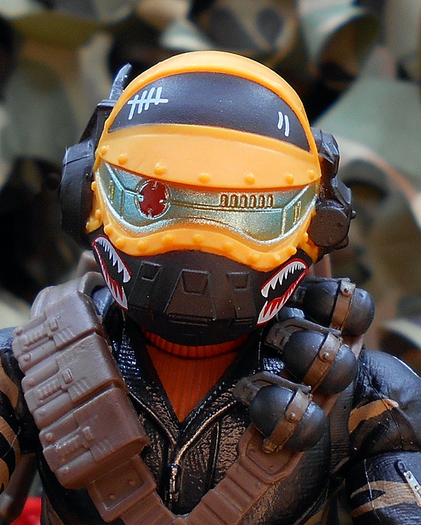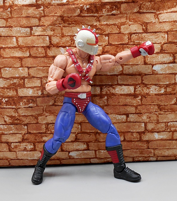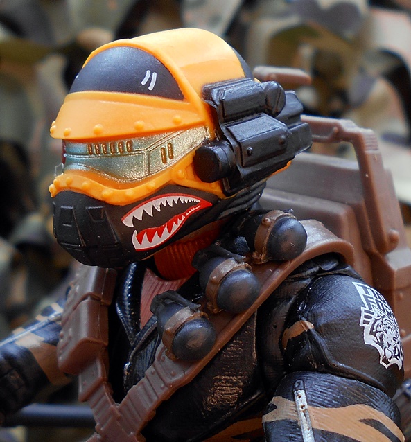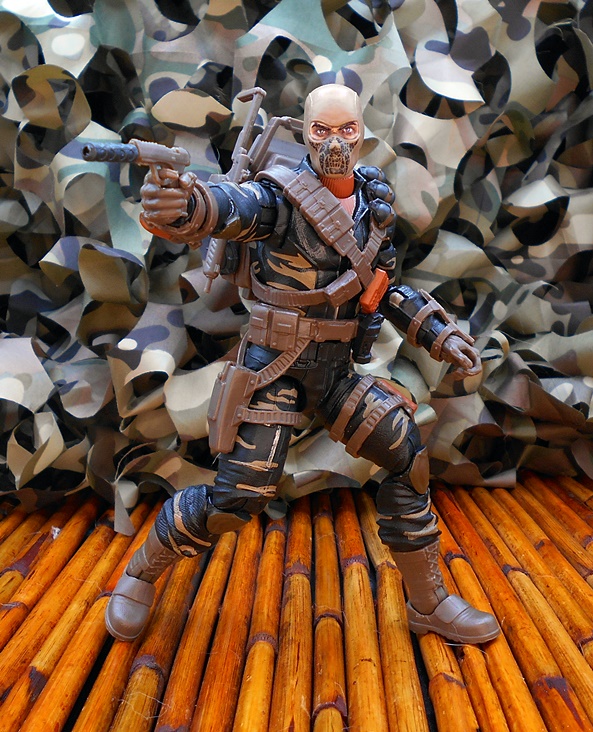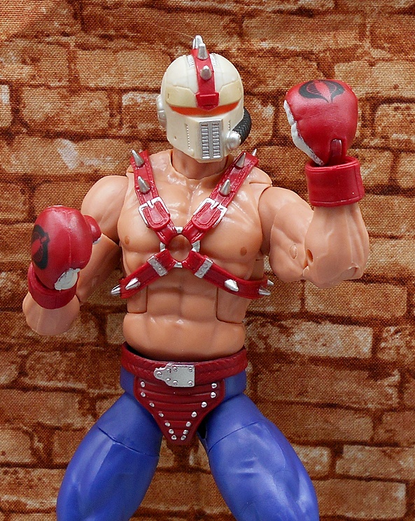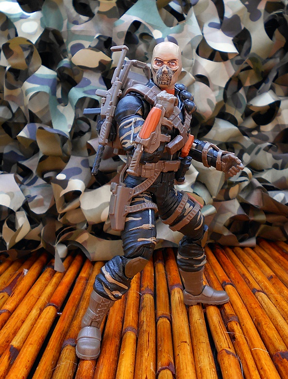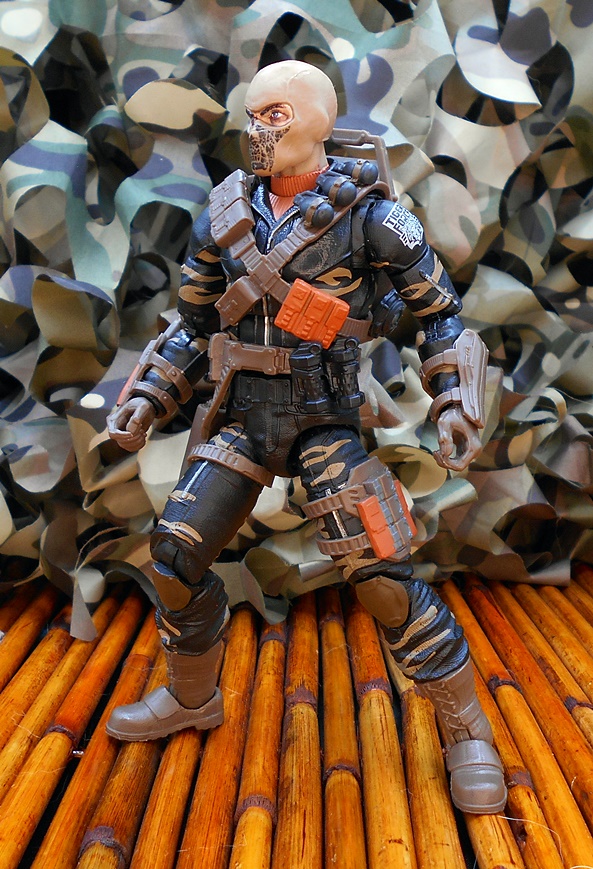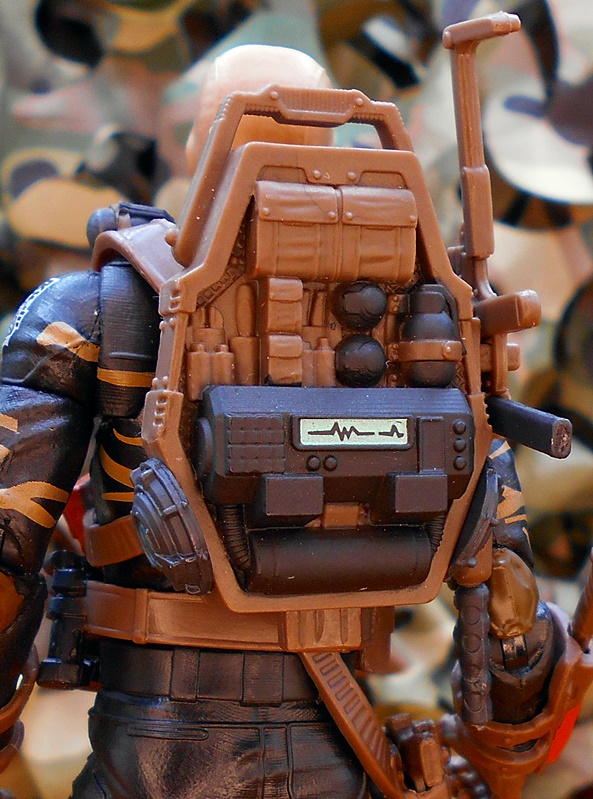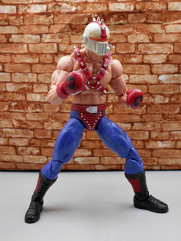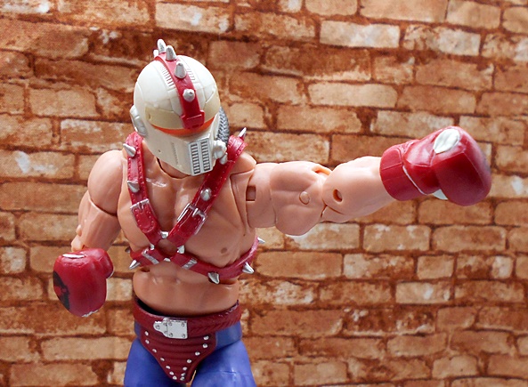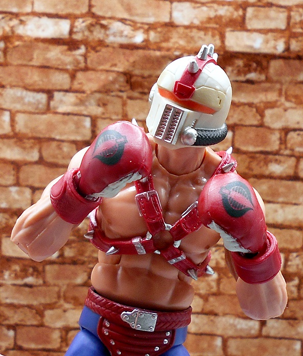 The head is completely covered giving him an intimidating anonymity. The combination of visor and snout over the nose and mouth gives me more than a hint of Star Wars Biker Scout helmet design. The deco for the face mask continues black, red, gold, and gray color scheme from the rest of the figure. The helmet is removable, although there isn’t much going on under it, and I dig the gold mohawk-like crest at the top.