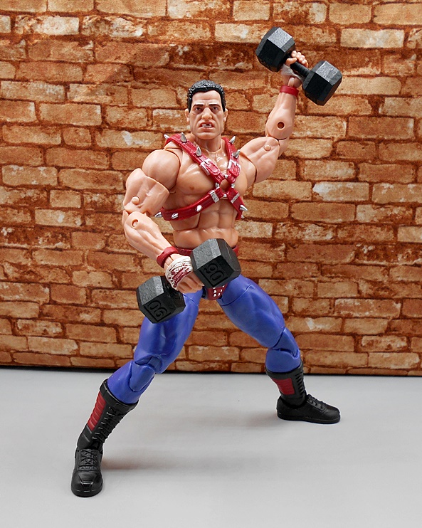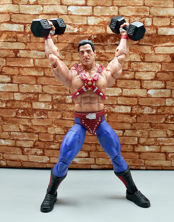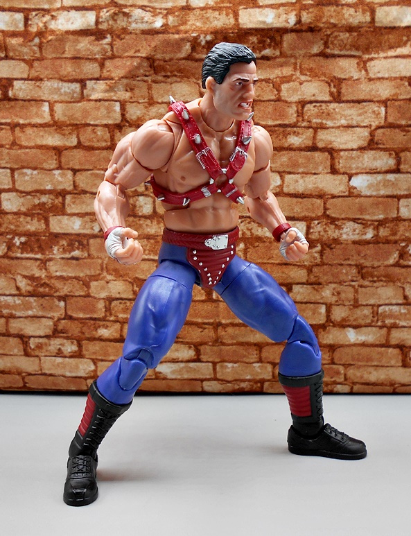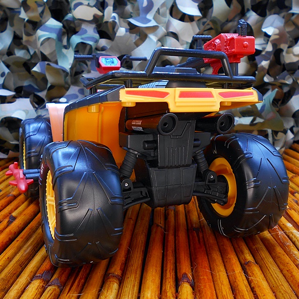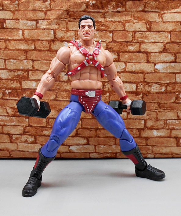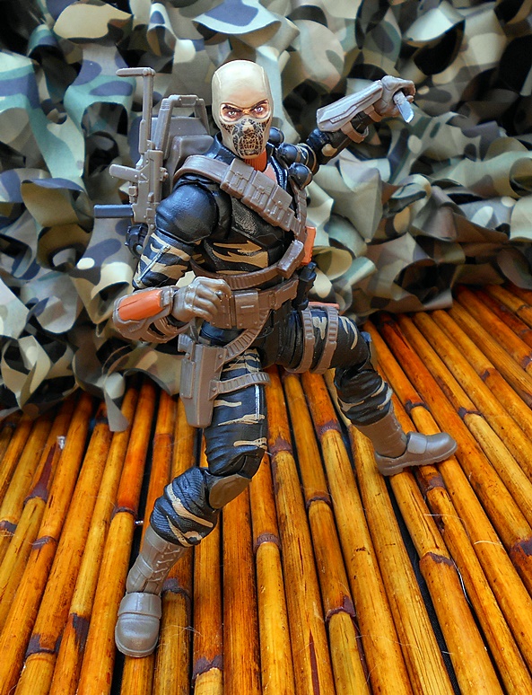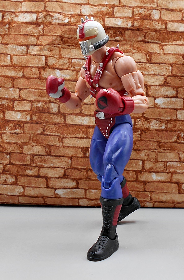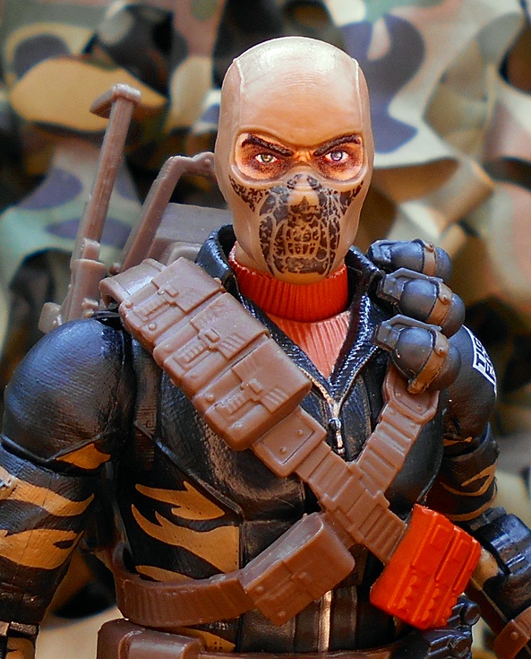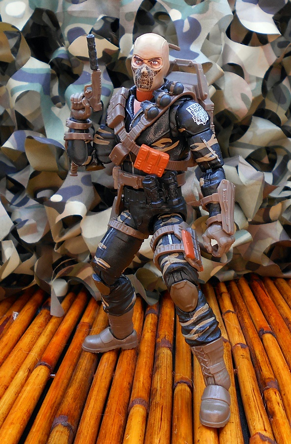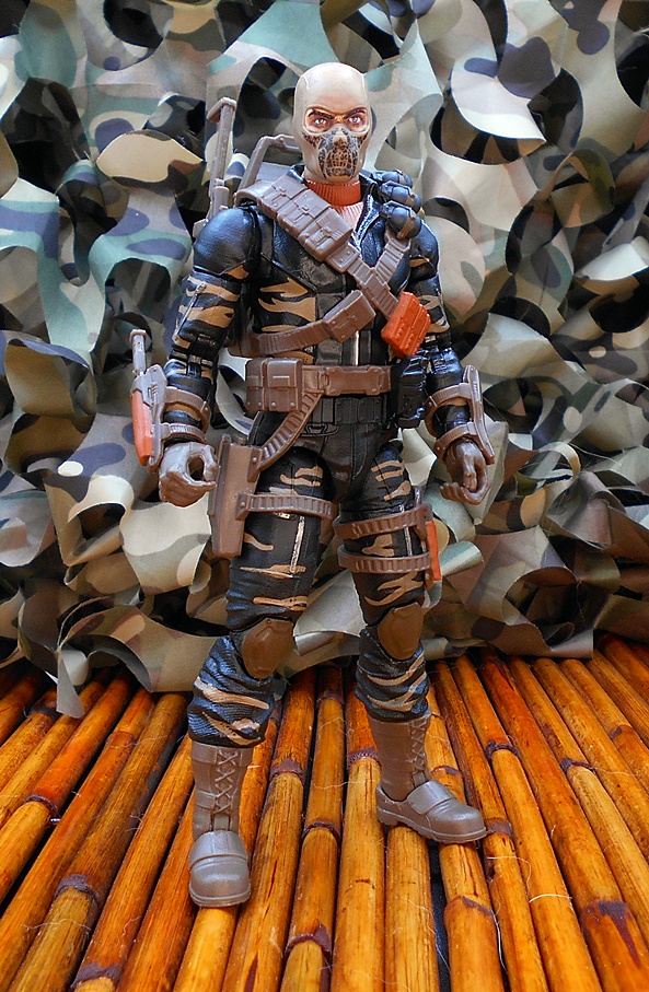 The head is completely covered giving him an intimidating anonymity. The combination of visor and snout over the nose and mouth gives me more than a hint of Star Wars Biker Scout helmet design. The deco for the face mask continues black, red, gold, and gray color scheme from the rest of the figure. The helmet is removable, although there isn’t much going on under it, and I dig the gold mohawk-like crest at the top.