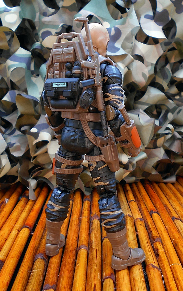 The holsters on his back carry the same weapon designs wielded by his boss and I think these are a great pairing to include with him. The large scoped laser pistol has a bit of gold plating on the top of the barrel and it’s just a really neat sci-fi inspired design with some excellent detail in the sculpt. This one is stored angled across the back. Meanwhile, he has the smaller pistol down on the back of his belt.