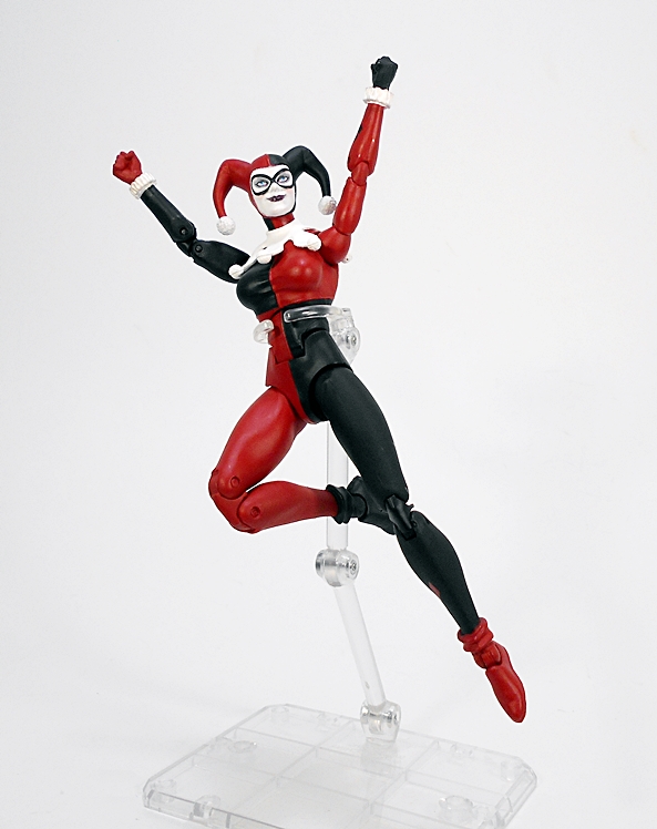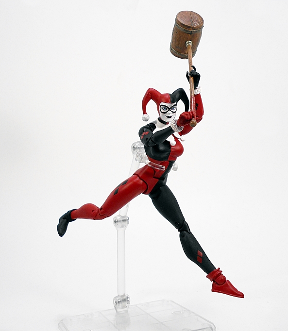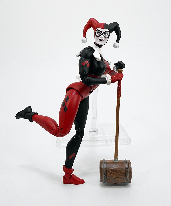 And here is Harley all set up! She comes in three pieces, all individually wrapped in plastic, and sandwiched between two pieces of styrofoam. The set up requires you to plug her into the base via two metal rods and attach her right arm via a magnet. Getting her slotted into the base was a little troublesome. At first I thought she wasn’t going to stand flush at all, but I gently coaxed the pegs out and tried again and again and one more time, and eventually got there. The magnet that holds the arm in is not very strong, but it is attached to a tab, so between the tab going into the socket and the magnet, the arm stays in place very well.