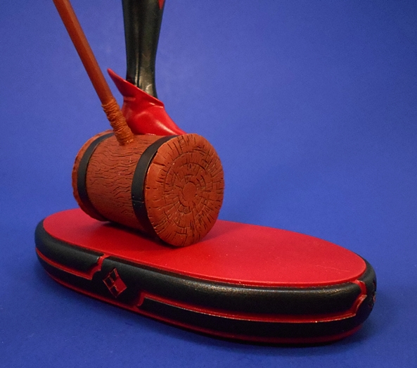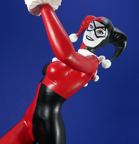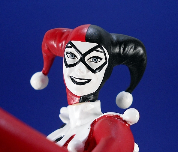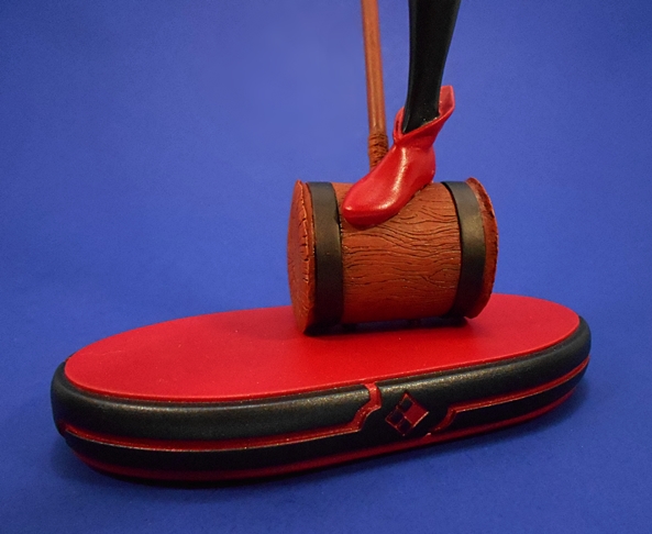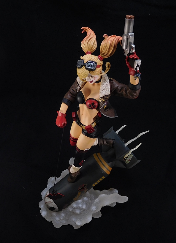 And that brings us to the portrait, which is excellent. Somehow they’ve managed to keep a little bit of Harley’s crazy and still maintain the homage they were going for. She looks absolutely delighted that she’s about to steer a bomb right into some unsuspecting target in Gotham’s cityscape. Her pigtails fly up behind her in the wind, and she has a pair of goggles secured to the top of her head. The paintwork on the face is as solid as the rest of the statue with immaculately painted eyes and lips. The white face paint isn’t overdone, and it’s worth mentioning here that the flesh tones on the rest of the figure are warm, even, and clean. I also love the pink tips on the ends of her blonde hair. It’s worth mentioning that because of the nature of the composition, Harley is looking down, so this is a piece that is going to best be displayed at eye level, or a little higher.