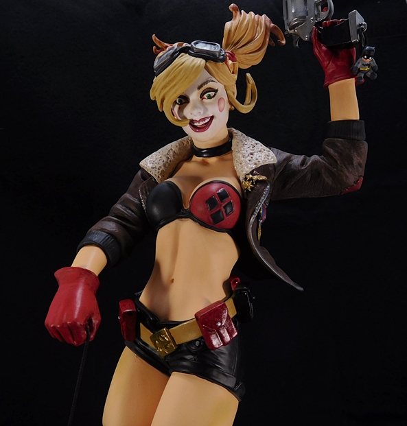 Harley’s wearing the same costume we saw in the original Bombshells statue and in her action figure and they did a beautiful job detailing it here. She’s got a pair of really short and pretty tight black shorts, secured with a golden batman utility belt with red and black pouches. Her feet feature a pair of brown boots worn with socks over red and black stockings. And she’s got a black and red bikini top with a vintage-style bomber jacket and red gloves. There’s some wonderful sculpted detail to be found in her wardrobe, from the knitted pattern of her socks, to the wear on her boots.