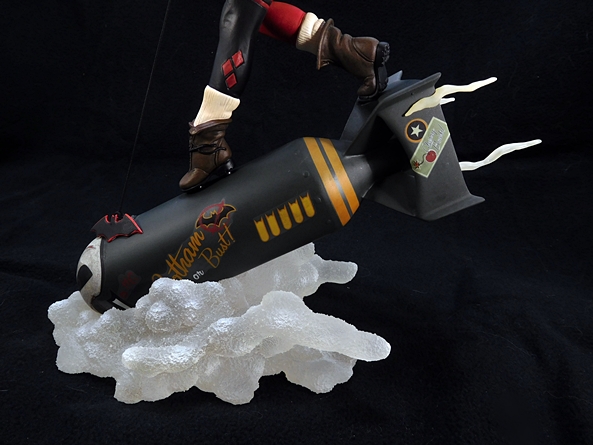 The base consists of the bomb sitting on an angle in a smokey-clear cloud with additional motion effects streaking off the back fins. The smoke is frosted clear plastic with some white paint and a rough texture. Effects like this are tough to do in this format, and I think it came out pretty good, but if I get in real close, the illusion tends to break down. The trailing effect parts are pretty delicate. One got knocked off, even while I was re-positioning the statue very carefully, but they’re tabbed in and it went right back on easily. The artwork on the bomb includes the “Gotham or Bust” slogan along with Harley’s initials, a bat symbol with a line through it and a “Cherry Bomb” sticker on the tail. I just love the whole look of this thing!