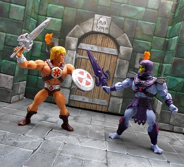 The figures come in a window box, which shows off the goods quite nicely. You also get an extended backflap with some absolutely bitchin vintage-style art of Adam and Cringer lazing about on an idyllic Eternian afternoon while three evil bastards spy on him from the foliage. The explosive exposition bubble announces the set is based on the 80’s Adventures and you get the Cartoon Collection sticker on the window, which mimics the rainbow lettering of the Filmation cartoon logo. Flip the box around and you get one of the most iconic pieces of MOTU art of all time, as Adam holds aloft his magic sword and says the words. Meanwhile the jaws of Castle Greyskull dominate the backdrop and Cringer cowers, knowing full well what comes next.