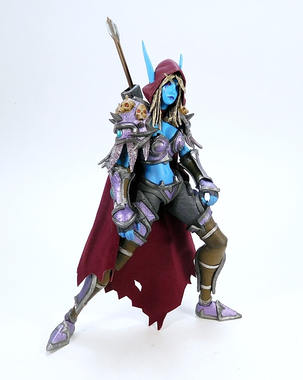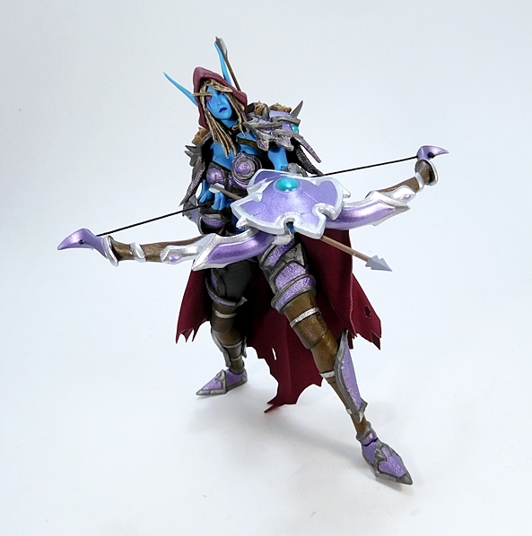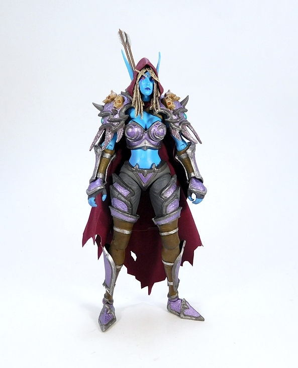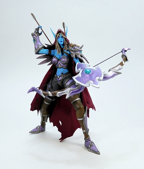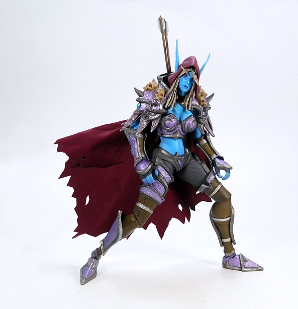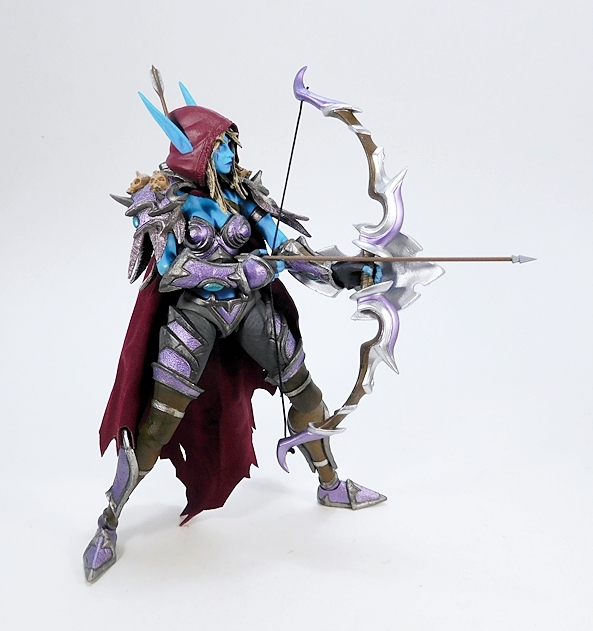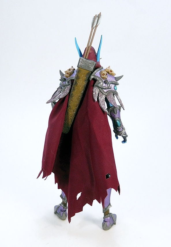 From the back, Sylvanas sports a purple fabric cape, which shows some considerable wear. She also has a quiver, which also has its share of nicks and scrapes from use. The quiver is designed to hold the loose arrows she comes with, but I’ve only been able to get two in there at a time. I’m not sure what’s going on down inside that thing, but the arrows are fragile and I don’t want to force them.
