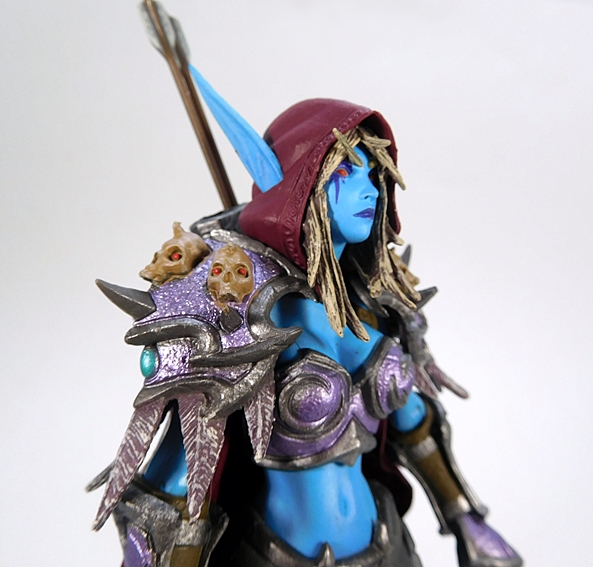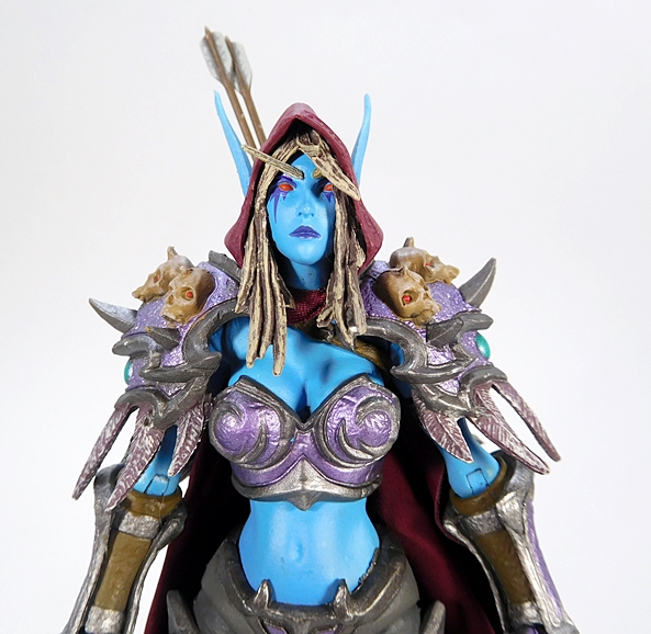 NECA did a bang up job on the portrait here. Sylvanas is wearing a sculpted hood with slits for her long and elegant ears to protrude through. Her wispy eyebrow extends out over her right eye, but her left eyebrow is concealed. Bits of her hair peek out from the hood to frame her face. Her eyes are beautifully painted, but they can be tough to see under normal conditions, because the hood casts a shadow over the top part of her beautiful face.