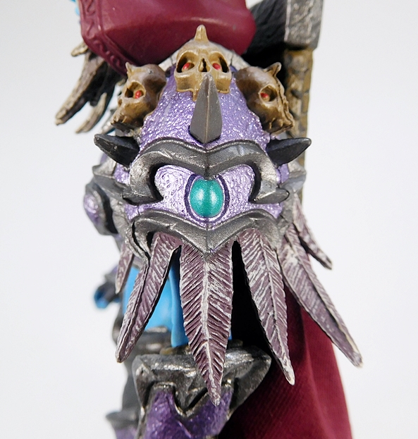 As with Thrall, the illusion of layered gear on this figure is very well done. The armor pieces are all part of the sculpt, but thanks to the carefully detailed underlying clothes and the sculpted straps and buckles, I could almost be convinced that she’s actually wearing the armor. The attention to detail in the shoulders is particularly exquisite. All the armor pieces have that wonderful hammered metal finish, the reinforced borders harbor tiny nicks and dents from battle, and the shoulders are adorned with spikes, sculpted feathers and tiny skulls.