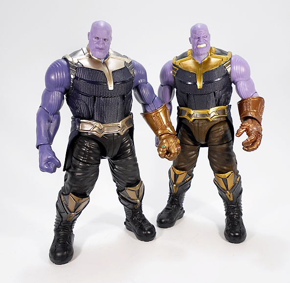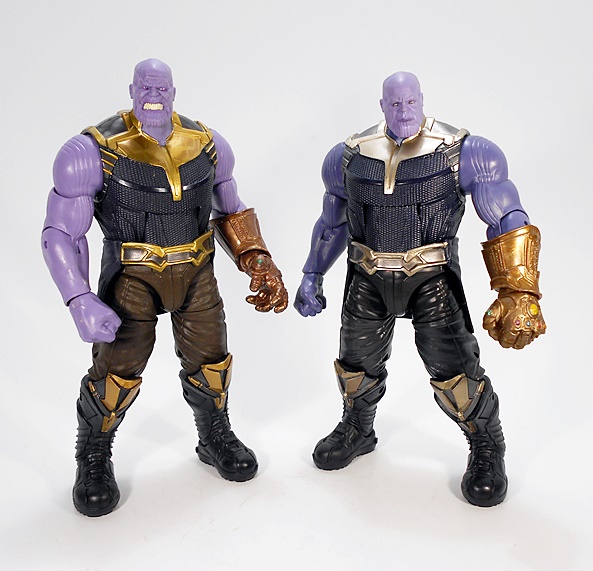 The head that comes on the figure features a very similar helmet to the older BAF. The ear discs are a little bigger, there are some other minor variations in the brow ridges, but overall they’re a pretty close match. The paint on my figure’s head could be neater, particularly where the gold is concerned. It’s not something that’s too noticeable with the naked eye when and the figure in hand, but it becomes quite apparent in close up shots. The portrait itself is excellent, with a slightly darker purple skin and plenty of crags and lines in the face. Here, Thanos’ mouth is agape, but he’s still showing plenty of teeth. He’s got a turnip nose, and black pits for eyes with tiny bright blue irises, that almost glow under the right light. Here, I’m a little less inclined to call the newer version an absolute winner, as I still really like the previous portrait. I’ll call it a toss up. If you are after swapping the heads, I find that it’s not a very good fit, but you can probably make it work, more or less.