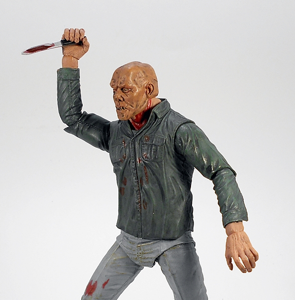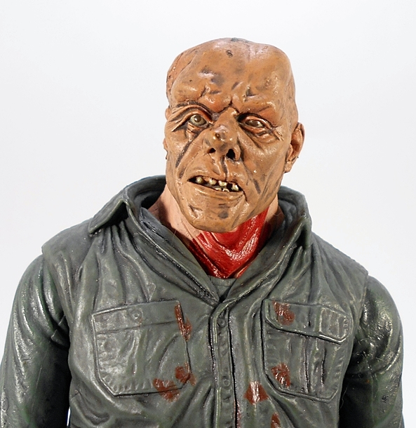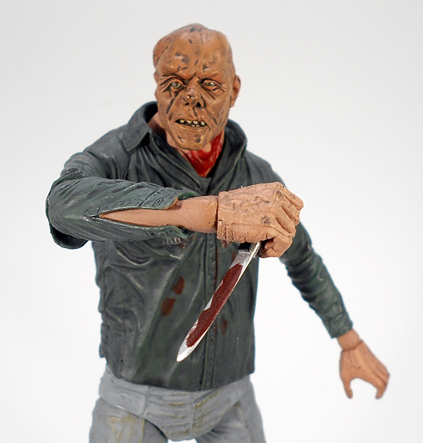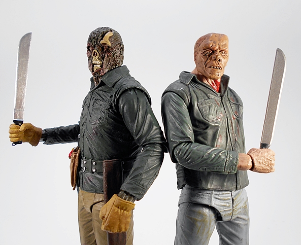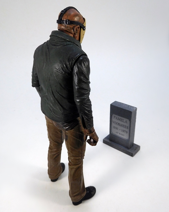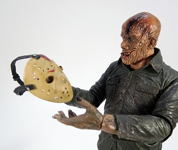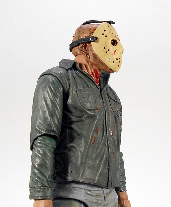 Jason comes with two heads and two hockey masks. The regular head has the mask held in place with rubbery straps, just like most of the previous releases. The lower left half of the mask has been chipped away to reveal a glimpse of the grim visage that hides behind it. The mask also has a chip in the top and some light scuffing, but otherwise it’s held together pretty well. It’s got a slightly glossy finish to it, which I dig a lot. The straps hold it nice and snug to the head, and the eye holes line up perfectly.