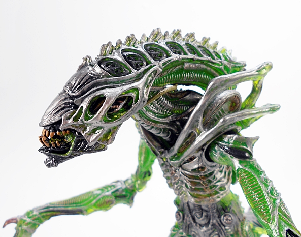 Sweet Jesus have mercy! He’s both breathtaking and hideous at the same time… even by Xenomorph standards. I have no words for how awesome this head is, but I’ll at least mention that I’m in love with that silver, barbed cranium. Also, check out those nasty teeth and black gums. And yes, if you were wondering, there is indeed a secondary mouth in there that extends out. And much to my delight, it’s cast in translucent plastic!