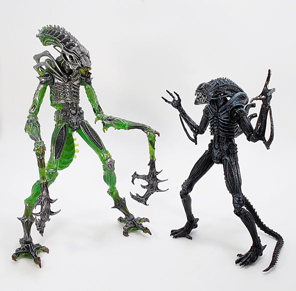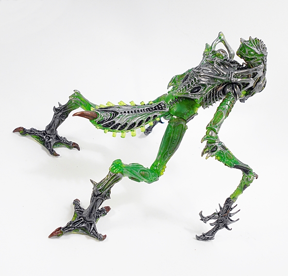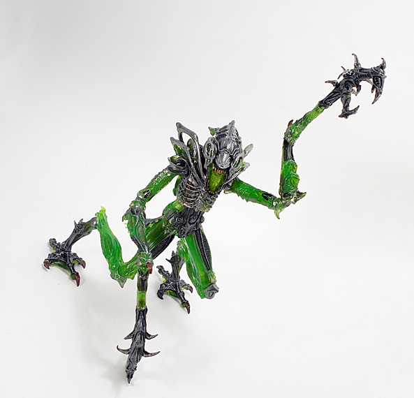 OK, I’m going to try really hard not to go into full on hyperbole mode here, but I am so absolutely gobsmacked by this figure that it’s going to be hard not to gush like crazy. I mean, I often refer to the wizards at NECA as fine craftsman, but holy hell if this figure isn’t an absolute work of art then I don’t know what is. I’m not one to get all weak in the knees at the sight of translucent plastic in my toys, but the marrying of regular plastic and the green translucent stuff on this figure is sheer poetry. It looks absolutely stunning in person. As for the design? Well it’s sheer nightmare fuel. Regular Xenos are bad enough, but this guy is just down right terrifying.