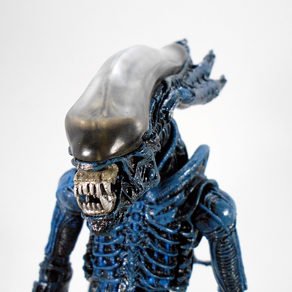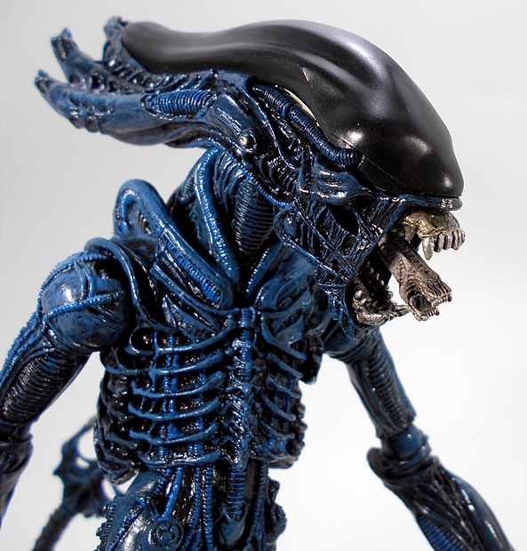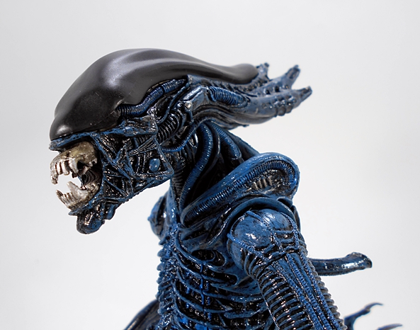 Yup, no matter how many of NECA’s Xenos I open, I never tire of taking in all that incredible detail that they sculpt into these bodies. Every little element of HR Giger’s infamous bio-tech design comes alive in this plastic and all of it is picked out by sumptuous blue paint wash, which invokes the crazy colors of the original toy and comic, while still managing to stay grounded in the realism of NECA’s re-imagining. Damn, I just adore the coloring on this Xeno! In addition to the black and blue deco, you get some silver highlights here and there.
