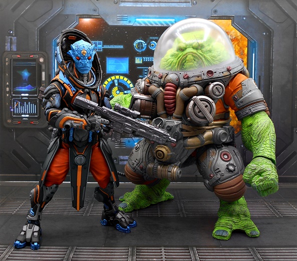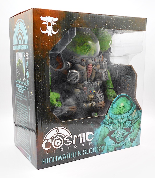Happy Friday all! You may have noticed that there was no content on Wednesday as i was hunkered down for the hurricane, but it passed us by leaving just a nasty taste of tropical storm force winds and lots of rain. But, I am back today and I’m continuing my look at the initial wave of Cosmic Legions figures! If you need to get caught up you can take a look at the two versions of Oleg Thygar, the four-armed brute, Kraggnar, and the femme fatales, Vorgga and Zeerian Spyre. Today I’m turning my attention to the big daddy of the wave: Highwarden Slogg. He is the biggest figure by far and he looks like one nasty piece of business.