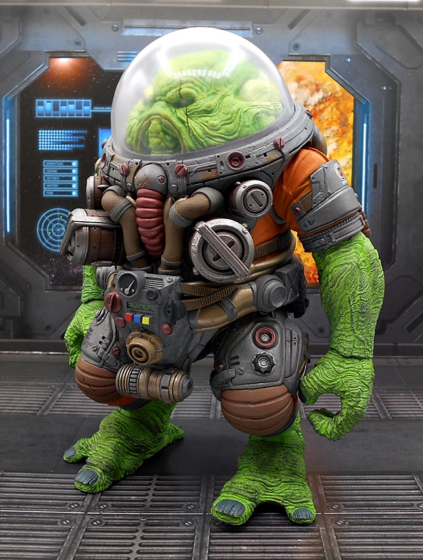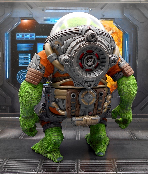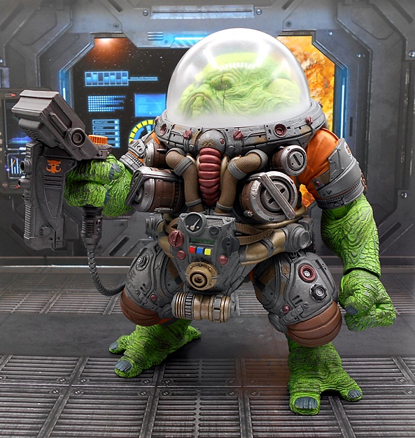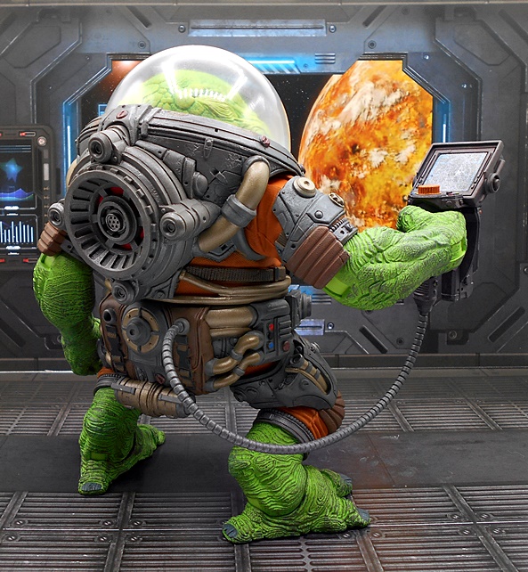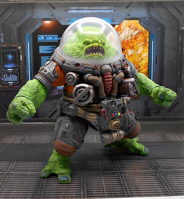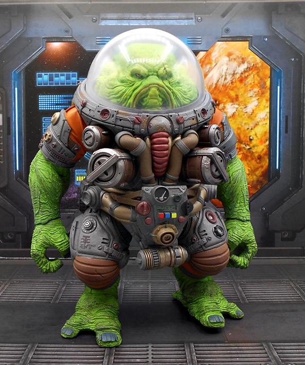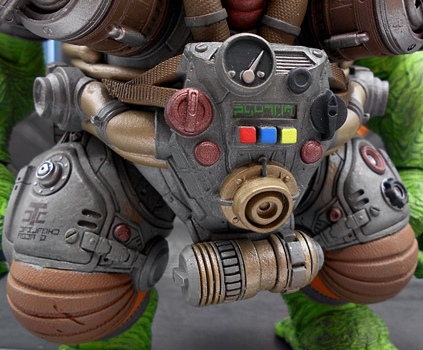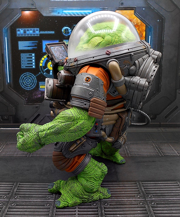 And yes indeed, he is one hefty hunk of plastic. Slogg’s impressive size is more girth than length, with most of it in his rather unique support suit. Slogg’s lower arms and legs are exposed showing his rough green skin, which is just covered with ridges and fissures. Meanwhile his bulbous head resides under a frosted dome that keeps him moist and flavorful. But how about the detail on that suit! You can just about make out the orange onesie that all the gear and equipment is grafted onto. Otherwise it’s a mess of tubes, hoses, pipes, fixtures, straps, buckles, gauges, and even a pair of what… nipple canisters? Sorry, I don’t know what else to call them. The dingy colors of the suit’s equipment looks great next to the bright green of the skin and the orange of the undersuit. You also get some bright red, blue, and yellow buttons down there in his groinular region. Gosh, there’s so much to see!