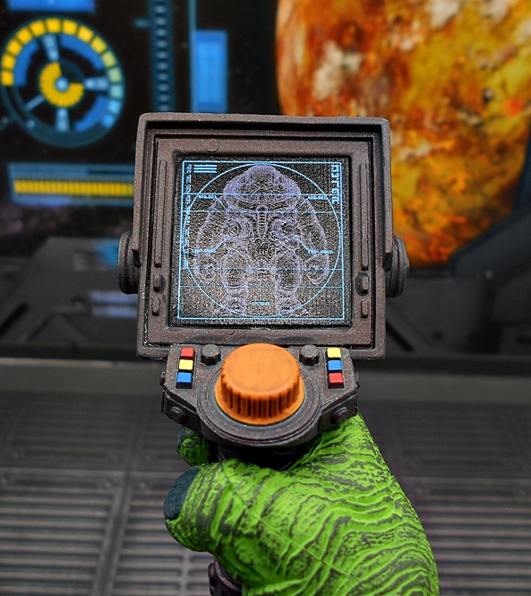 And that accessory is what T4H call a Data Screen. This device has a cable that plugs into one of the two holes on his butt, depending on which hand you want him to hold it in. Now, this looks to me like it’s a multipurpose device used to check on the status of his suit, as it looks like a suit schematic is displayed on the screen. It’s kind of a burdensome device to carry around for suit diagnostics, so I’d like to think it serves a double purpose.