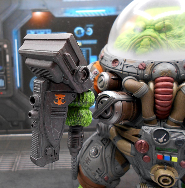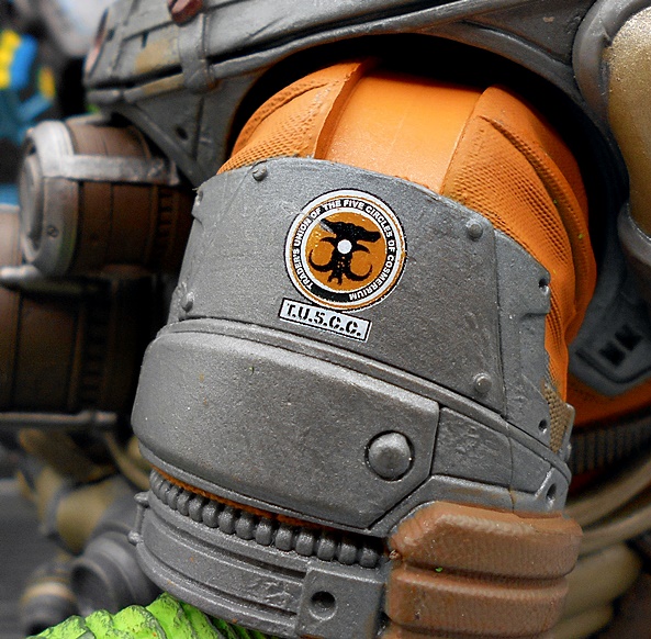 Indeed, when I first got Slogg out of the box I had a great time just turning the figure over and over in my hands and examining all the little bits and bobs. I really like the alien lettering stenciled here and there. Also, I’m pretty sure that’s a pee port located right in between his legs, possibly with an evacuation nozzle stored below it that has to be attached for him to relieve himself. I don’t know, folks, but I’m having fun making it up as I go. He also has a TU5CC badge on his shoulder, which stands for Trader’s Union of the Five Circles of Cosmerrium. Yeah, that’s a mouthful and we’ll learn more about it in the next Cosmic Legions review!