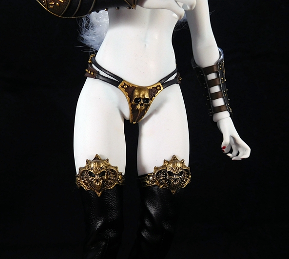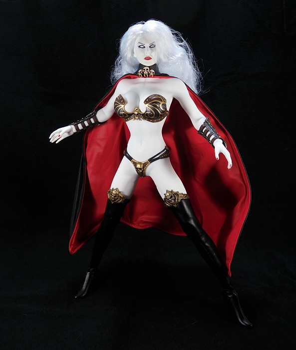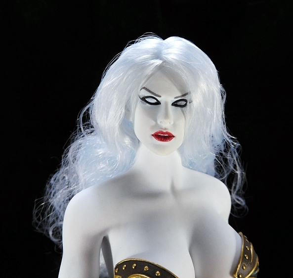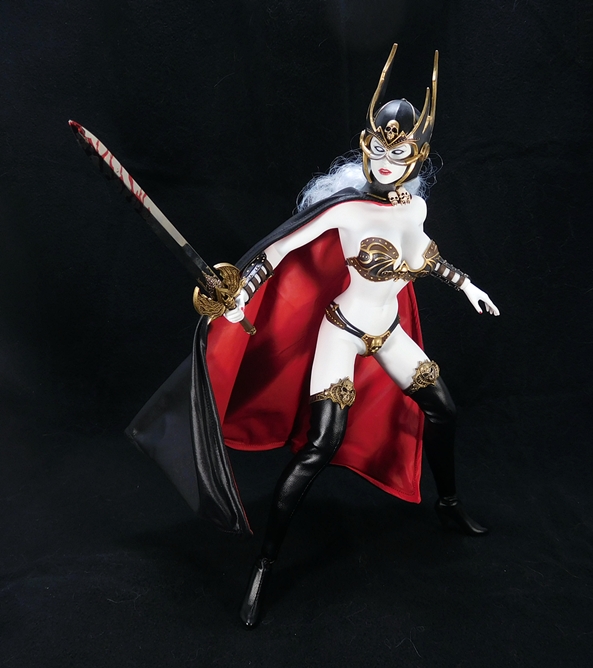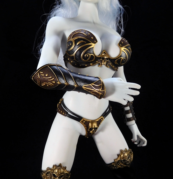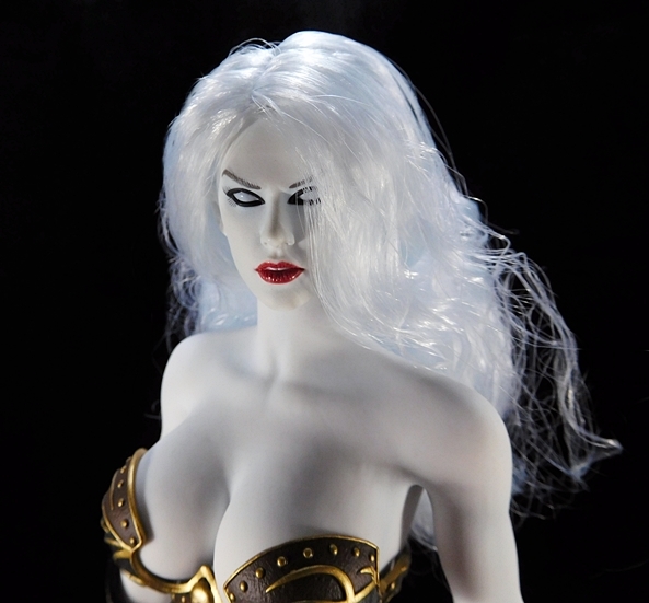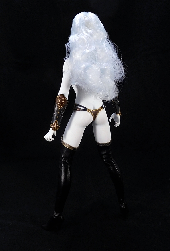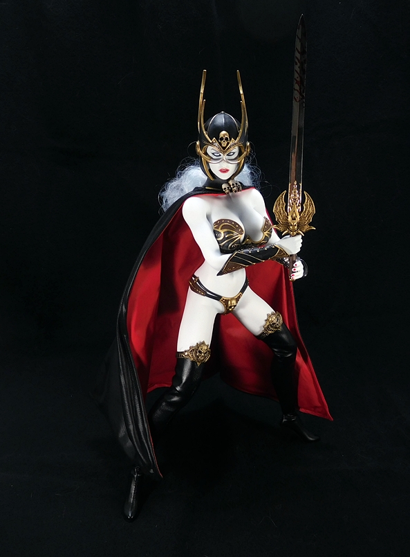The portrait is right on target, even if it is a rather soft sculpt, it still manages to capture Lady Death’s powerful beauty. Her lips are painted bright crimson and she has black eyebrows as well as black liner around her pupil-less eyes. All of these applications are razor sharp. Her flowing white hair is sculpted as part of the head and features some black wash and blue highlights. It’s also sculpted slightly above the shoulders so that her copious coif doesn’t curtail her neck articulation. Would I have liked an alternate head with a fierce expression? Sure! But given that we only had one, I’m very content with the more neutral tone.