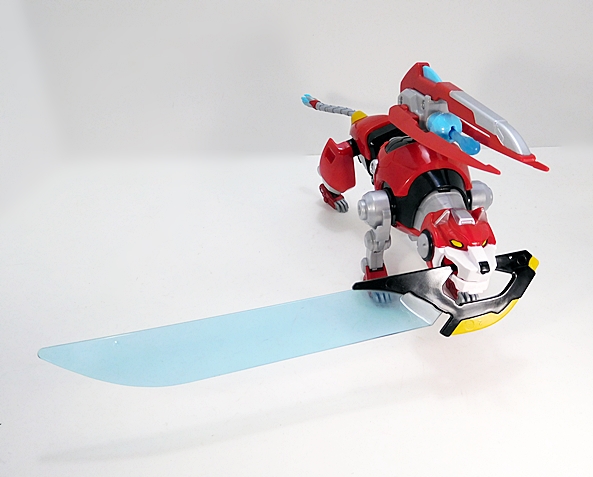 So let’s talk articulation. There are some useful points here and some not-so-useful ones. If you’re talking playability, I’d say there’s a ton of fun to be had here, but in terms of poseability, then not so much. Voltron looks great standing there on the shelf, but as soon as I try to get him into some cool poses, I find out that he really is a lot more limiting than I had hoped. From the waist down, things are actually not bad. The hips offer the possibility of a wide stance, the knee ratchets are pretty strong, and you do have those swivels in the thighs. One thing to note while posing the legs is that the front legs on the Blue and Yellow Lions do not lock into place and since these serve as heel spurs, this can be good and bad and bad news. The good news is it lets you tweak them for stability in different poses. This helps since there are no ankle tilts. The bad news is, sometimes they will give way under the weight of a pose. In fairness, I had the same problem with Matty’s far more expensive Classic Voltron, so it’s not something that is unique to this toy.