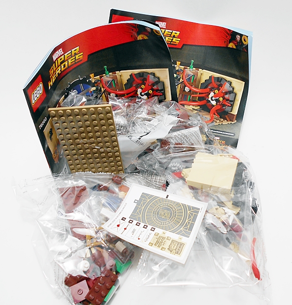 The set comes in a long, narrow box with the Marvel Super Heroes branding. It contains three numbered bags, containing 358 pieces, including a loose base plate. You also get a sticker sheet, two instruction manuals, and a small box containing Strange’s Cloak of Levitation. When you’re all done with the build, you get three Minifigs and the Sanctum Sanctorum playset. Let’s start with the Minifigs!