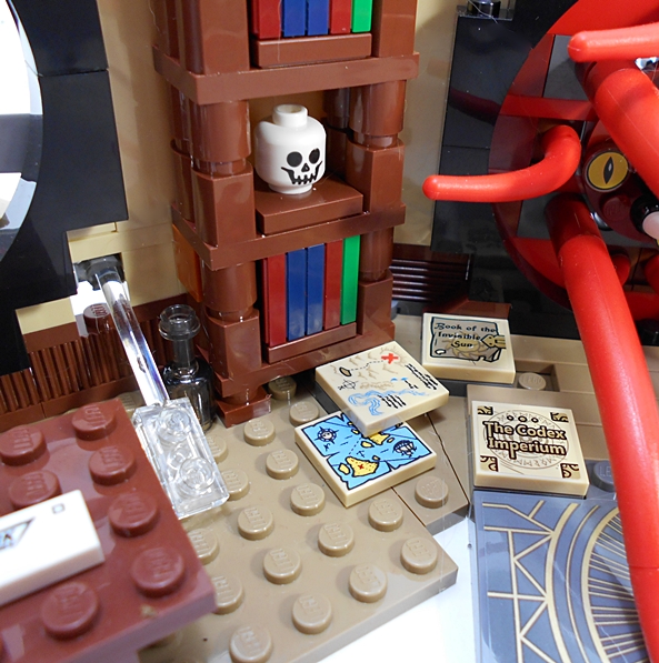 A little further to the right and we have another bookcase, this time with two shelves of books and a skull on the center shelf. There’s a bottle beside it and another on the top. You also get a pile of ancient books and maps. A couple of these are printed and are re-used from other sets. I’m pretty sure I have a few of those pirate maps already. The two books use stickers and one is The Codex Imperium!