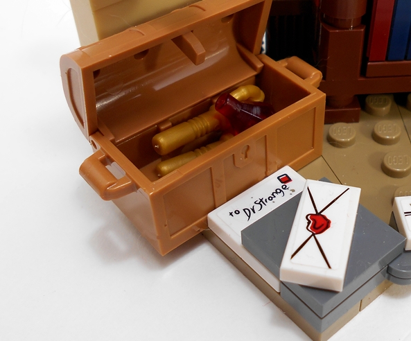 To the extreme left of the Sanctum there’s a treasure chest and a bookcase. The bookcase features some books on the bottom shelf, a top hat on the second shelf, and a mystical crystal on the third. The top features a lamp and a chain. That black lever thing is supposed to be used to levitate the Cloak of Levitation. Honestly, it was such a pain in the ass to get the Cloak on the Minifig, I’m not going to bother taking it off to try this out. It’s kind of an eyesore for what is a pretty mediocre gimmick, and it requires you to display your Strange Minifig without his Cloak, and who wants to do that?