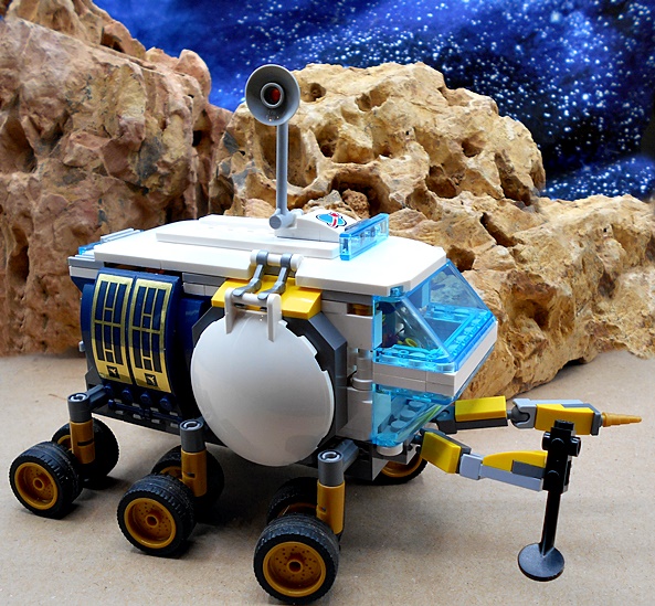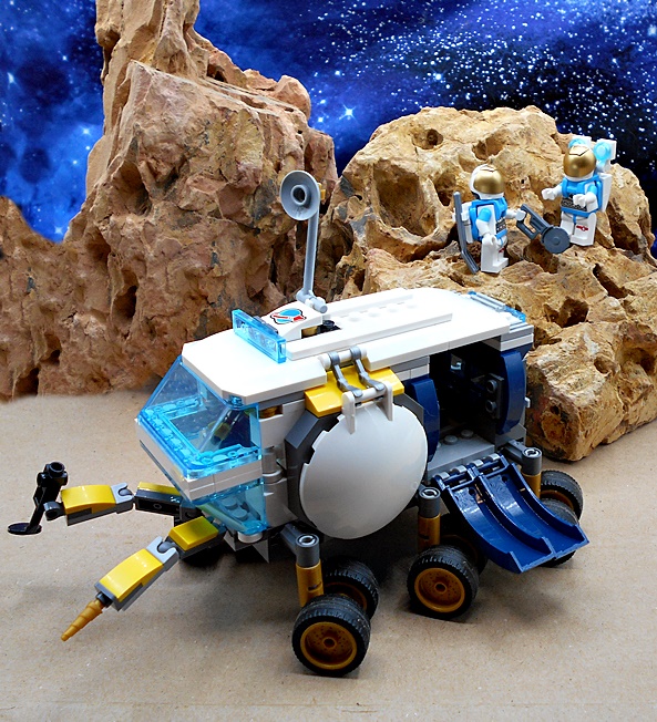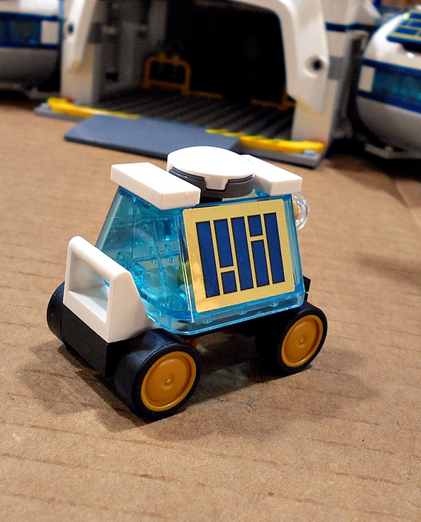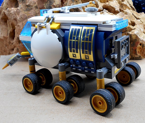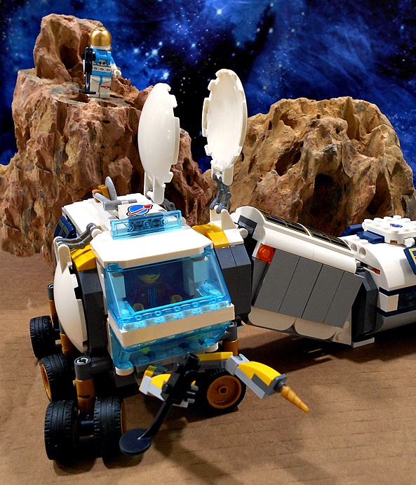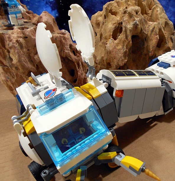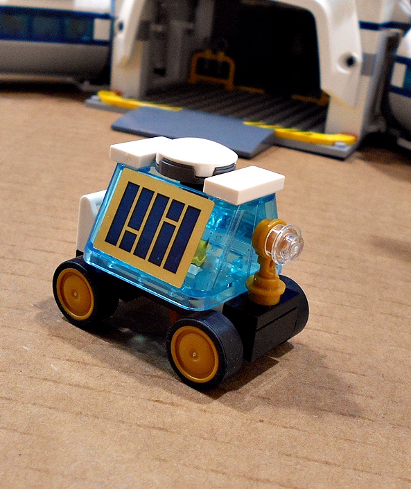The Rover is a fun build, but I’m a little iffy on the final model. It’s super clunky and looks absolutely nothing like the concept design that it’s based on. In fact, this thing is just plain ugly. The Rover rolls along on six sets of dual wheels, each of which can rotate 360-degrees, which makes for a spectacle of chaos when this thing is in motion, but it is interesting to see it roll. The cab has an upper and lower windshield, which looks good, there’s a blue lightbar on top, as well as an articulated radar dish. The back has a platform that drops down like a tailgate, which I guess can be used to haul cargo or samples, and it also has clips for tool storage. There are five stickers visible on the outside of the Rover, four are gold solar-panel type stickers on the side hatches, and the fifth is the space agency logo on the top.