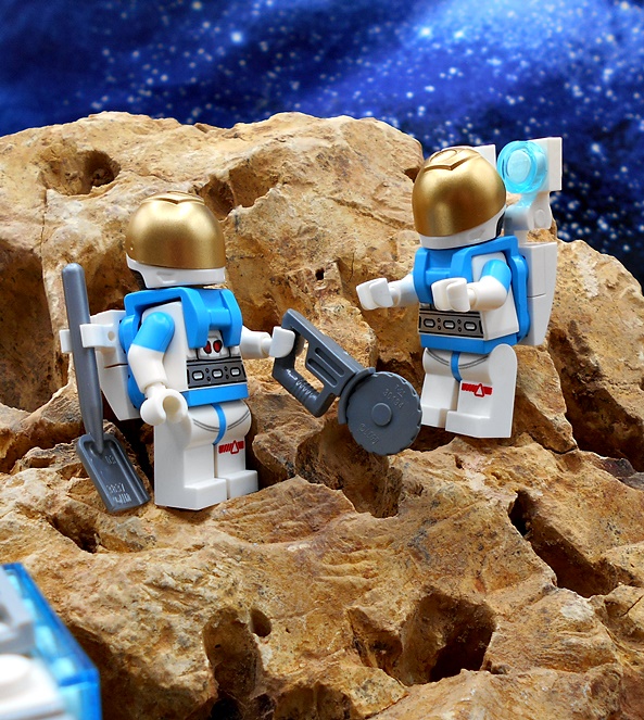 The astronauts all use the same bodies, helmets, and backpack harness, but one of the backpacks is built differently having clips on the sides to store tools. These are essentially the same astronauts that we saw with the Lunar Roving Vehicle set, and that’s appropriate, since we’ll see later that the two sets are very compatible. The gold helmet visors are removable to reveal that you get one man and two women. You also get hair pieces for all of them for when you remove the helmets entirely, and each head only has one face print. You get a metal detector for one of the astronauts, and I gave the other a drill taken from the large inventory of tools that comes with this set. The printing is crisp and colorful, and the backpacks each get stickers.