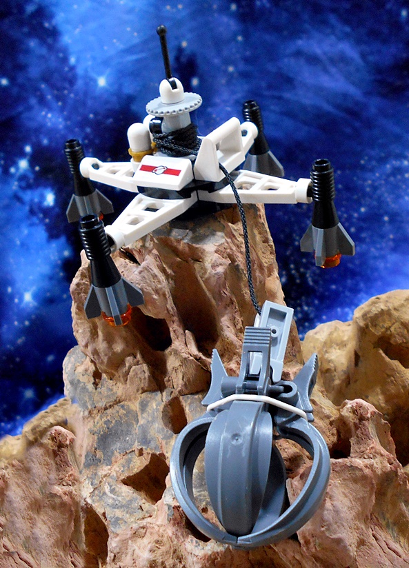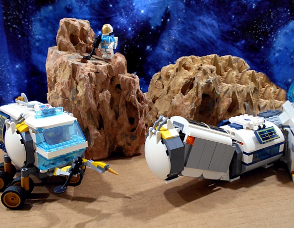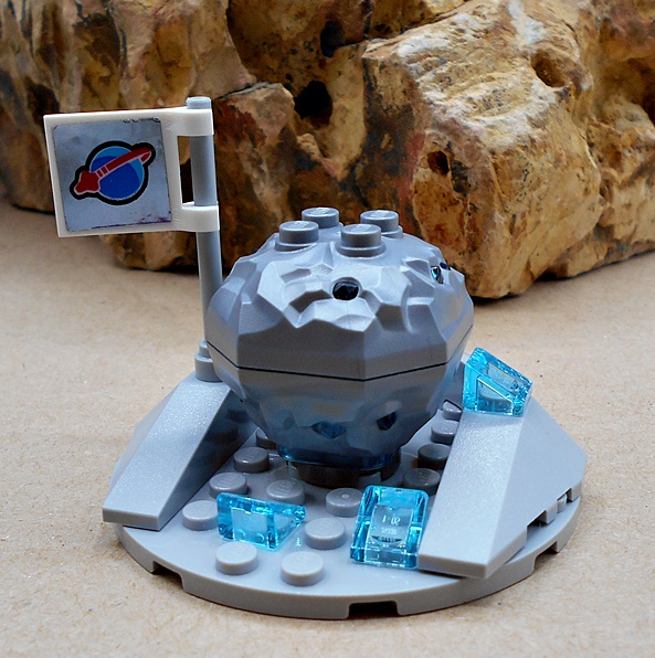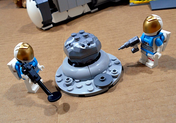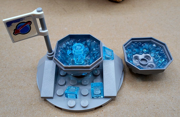 You get a Mineral Deposit, which is basically a big rock on a pedestal, along with a space agency flag to show those filthy Commies that it belongs to us! I really dig how they did this, with the rock opening to reveal translucent blue crystals inside, as well as a single crystal that can be removed as a sample. It’s a lot more interesting than the paltry little samples that came with the Shuttle set.