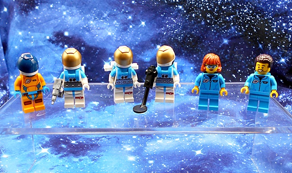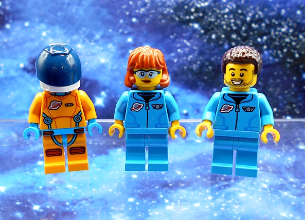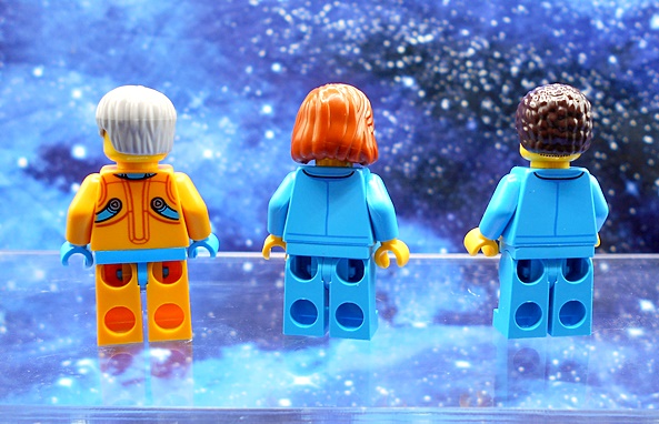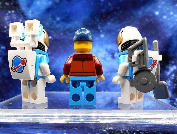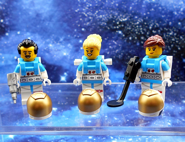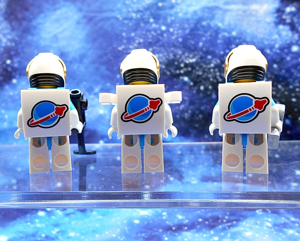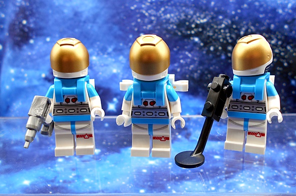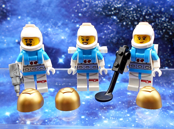 The gold solar screen visors lift off to reveal their faces and, unlike the Pilot, these figures have hairpieces so you can take their helmets off completely. I dig all three of these Minifigs a lot!