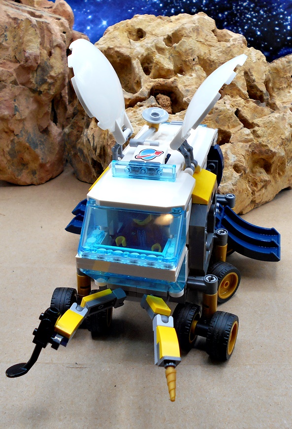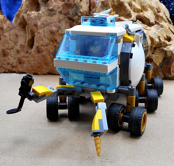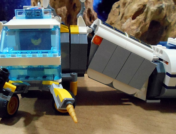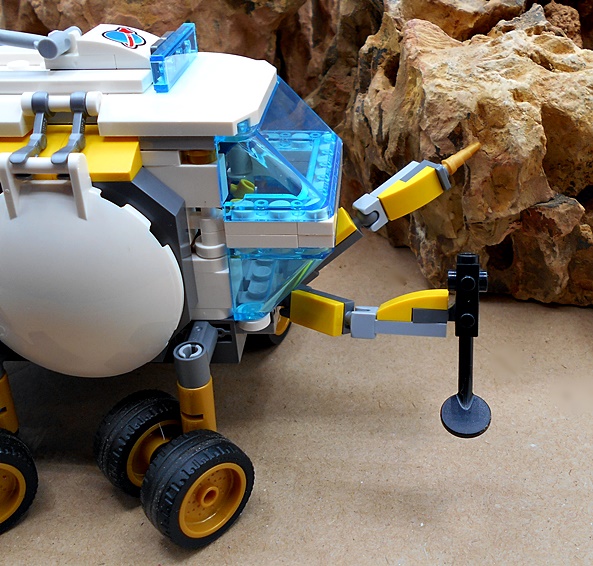 The front of the vehicle has two articulated arms, one with a build in drill and the other with a clip that holds a metal detector-type device. The detector can be swapped out to be used by one of the Astronauts, and you can put the circular saw in this arm so the Rover can dig. I’m not a big fan of the way these arms are built, as they just look kind of awkward.