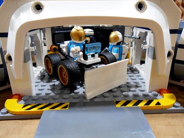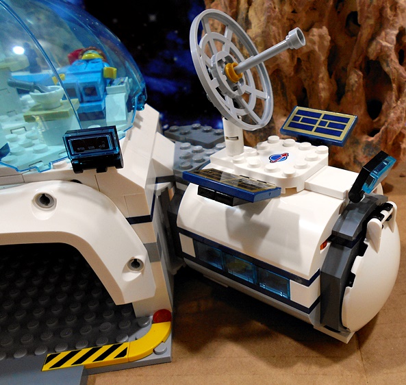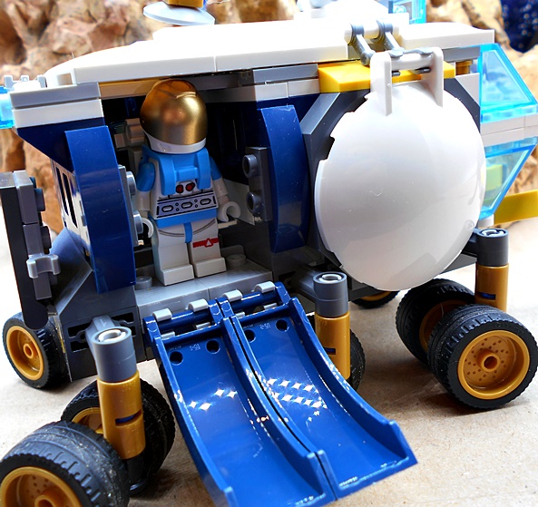 The vehicle opens on both sides, with the large circular ports leading into the cabin and the blue solar-panel-type hatches leading to an airlock compartment. It’s pretty tight quarters in the vehicle, but if you put on Astronaut in the airlock and one in the back of the cabin, you can load everyone onto the Rover. There’s no access from the airlock to the cabin, so that whole thing has to work with the power of your imagination! It also seems kind of odd that the side pieces with the solar panel stickers drop down rather than rise up to collect those rays!