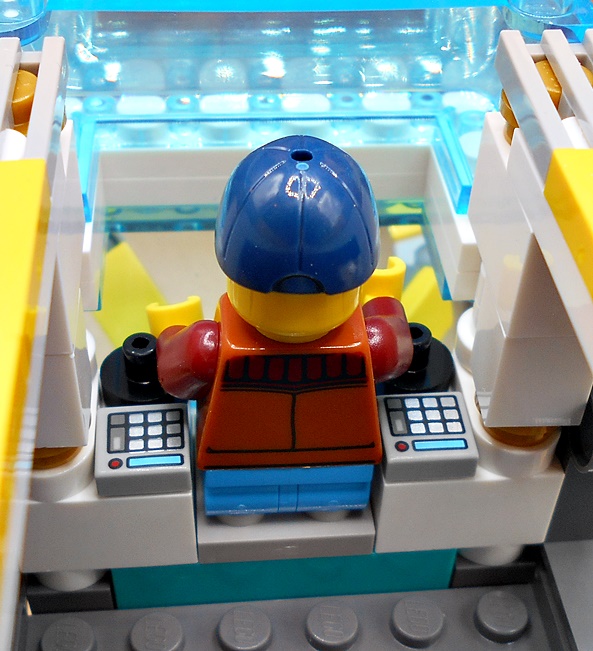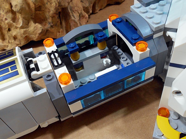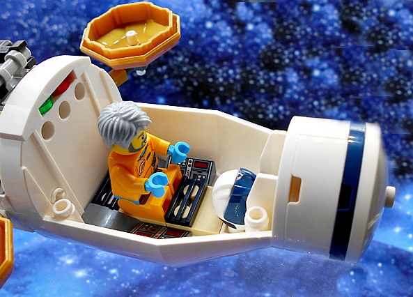 The cockpit module is attached by two technic pieces, so you can detach it. I’m not sure if it’s intentional since it has no propulsion of its own, but I guess it can be used for emergencies if the engine overloads and is about to explode. The cockpit is both roomy and sparse. There’s a place for the pilot to take his helmet off and stow it and there are a couple of control panels on each side.