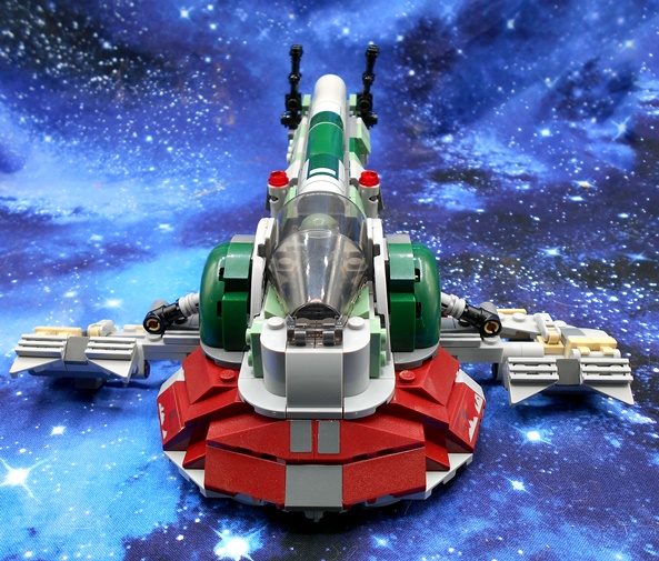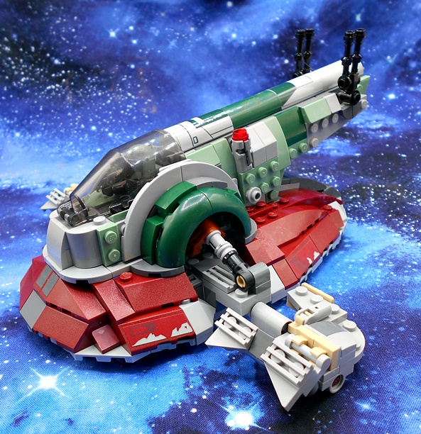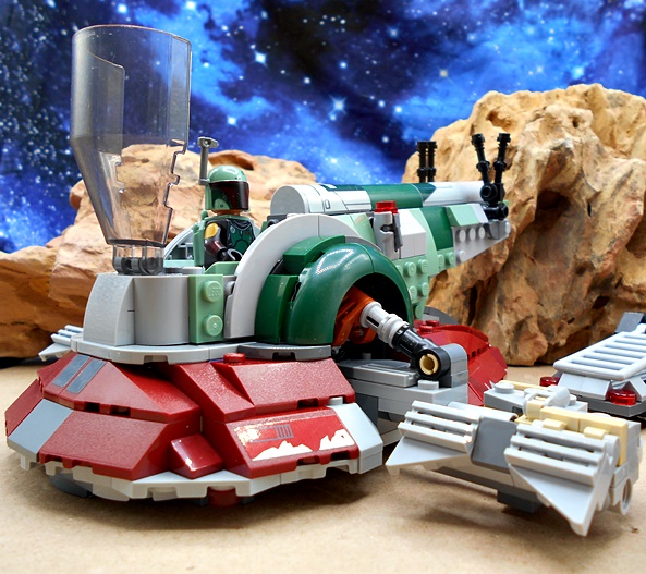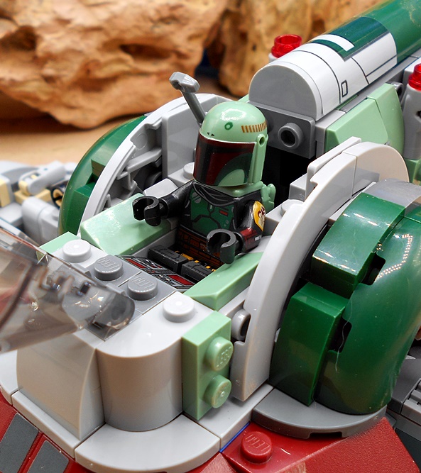 Here’s “Prisoners-With-Jobs-1” all assembled and looking pretty cool. So straightaway, if the size and cost of this set didn’t tip you off, don’t come into this one expecting a full scale model of Slave-1. It’s a substantial build, but as you can see, it’s scaled down a bit when compared to the Minifigs. The build is completely solid, which means the back doesn’t open up or anything beyond there being a sliding ramp with a slot to stow the Carbonite slab. And that’s fine, given it’s size. The fact that it is a solid build means the ship is pretty hefty and takes to being handled well. I ran into some difficulties assembling the side pieces, but I’m going to chalk that up to the way it was illustrated in the booklet and the few drinkys I had while building. As for aesthetics, I think it’s a good looking model, but I have two nitpicks. The canopy is a little flimsy the way it closes up and obviously doesn’t seal shut, and the guns on the tail boom are rather oversized. Neither are deal-breakers for me, especially given the size of the set.