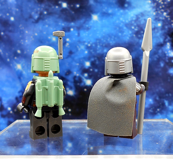 The figs are Boba Fett and Mando, and these are pretty straightforward. Boba has his jetpack and Mando has a cape. Both have articulated range finders on their helmets, Boba comes with a blaster carbine, Mando has his spear, and there’s an extra blaster pistol if you want to give it to Mando. Only Boba comes with a jetpack, but Mando comes with a cape. Boba has a printed face, so you can display him with his helmet off if you want, whereas Mando just has a blank head under there, which feels kind of cheap. I know he rarely takes that bucket off his head, but he has in the show, so I think we should have had a printed face on there. But, it’s no biggie. I am particularly happy to have the Beskar Armor Mando, since the one I have that came with the AT-ST set is in his original armor. I also have to give props to the beautiful printing that makes up Boba Fett’s armor. It’s crisp and colorful and looks fantastic.