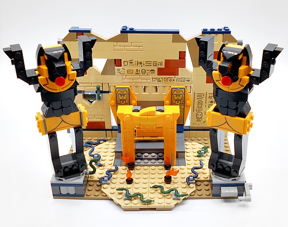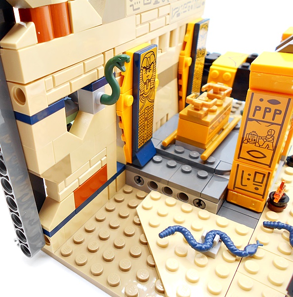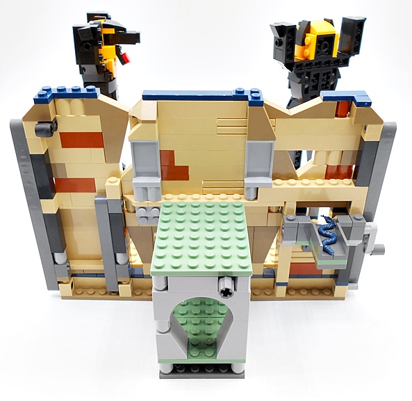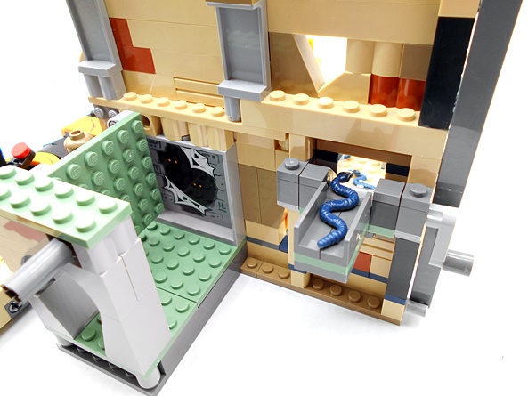 The back of the playset is a little unfinished, and you can see where some of the gimmicks are set up. I do like the little raised platform and covered hallway as it offers a little more play space for figures. On the right you can see a little chute that can be used to drop snakes into the front of the playset using the lever. They drop out to the left of the Ark alter right where the snake is coming out of the wall. It’s funny because I had no idea what that was going to be even when I was building it. Each of the snakes on the floor come with clips to keep them in place.