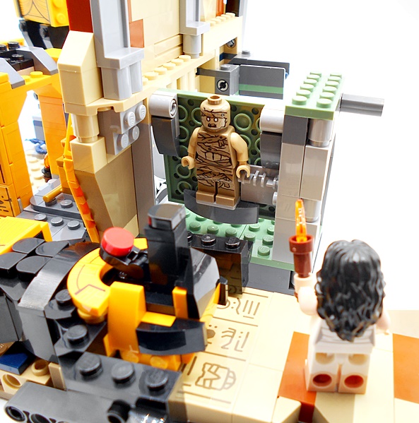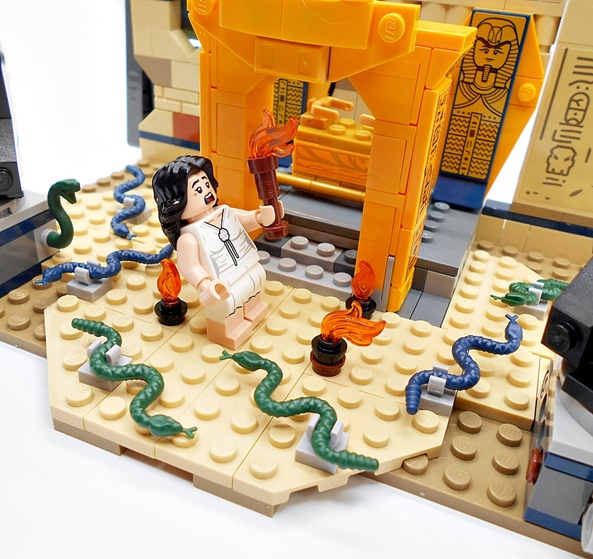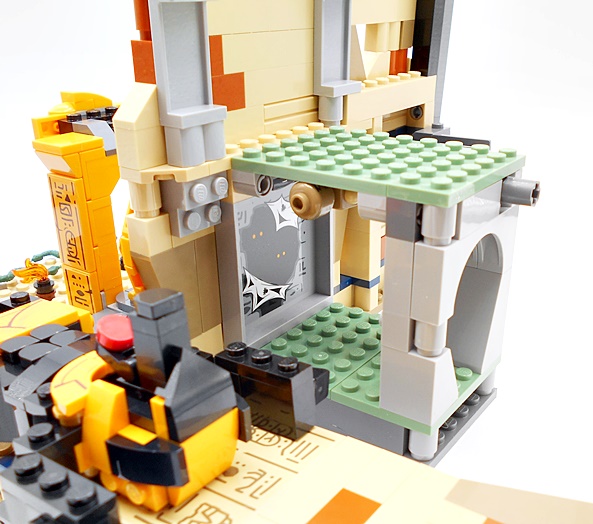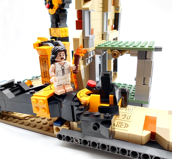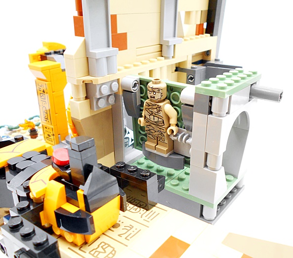The final feature recreates the scene where Marion goes through the fallen wall and the Mummy springs out and scares the shit out of her (and 12yo me as well!). The Mummy Minifig hides under the raised platform and when you pull on the technic piece the platform swings out to reveal him. Again, a very simple bit of engineering that works beautifully. I also dig the creepy sticker in the alcove which features some spiderwebbing and mysterious eyes glowing in the darkness.