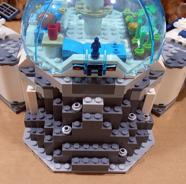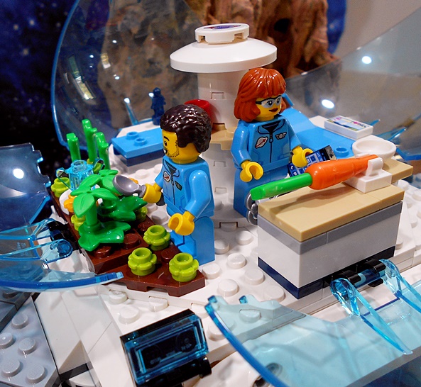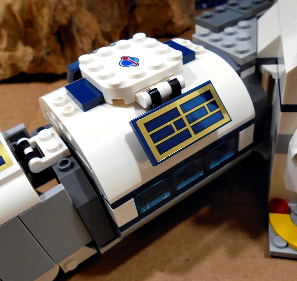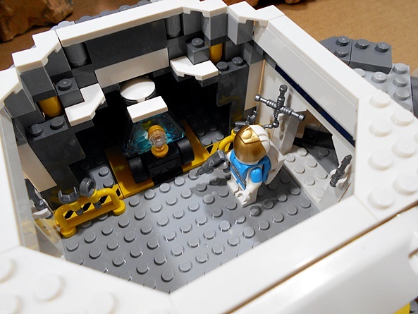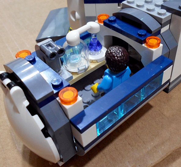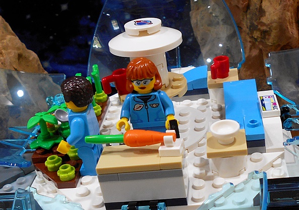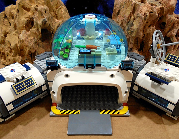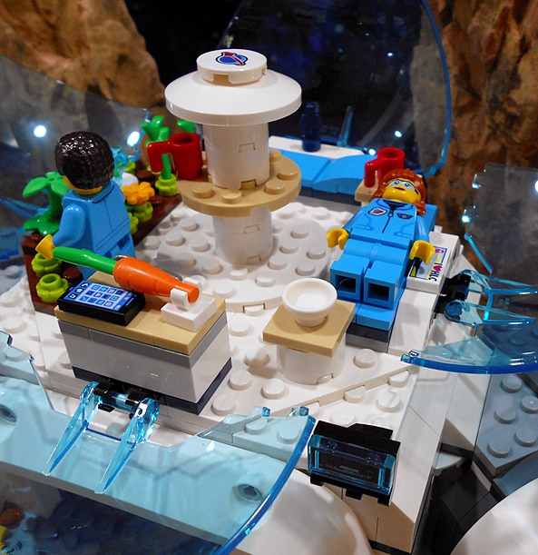 The transparent dome on the top of the Research Base opens up to allow you access. But only pretend access, because if the dome actually opened, the Minifigs would did of asphyxiation. Inside are sleeping quarters with two beds, a work station, and a hydroponics area. These scientists seem to be focused on growing vegetable life in space, and it looks like they’ve produced some sort of giant mutant carrot. It was fun building all of the plant life, and if you don’t want to follow the instructions, you can just go wild and come with all sorts of fun combinations. The central column has a circular table for coffee mugs, with additional space on thet wo end tables by the beds. There’s a smart-phone accessory, which I think is probably intended as a work tablet.