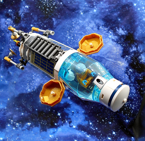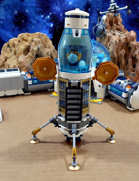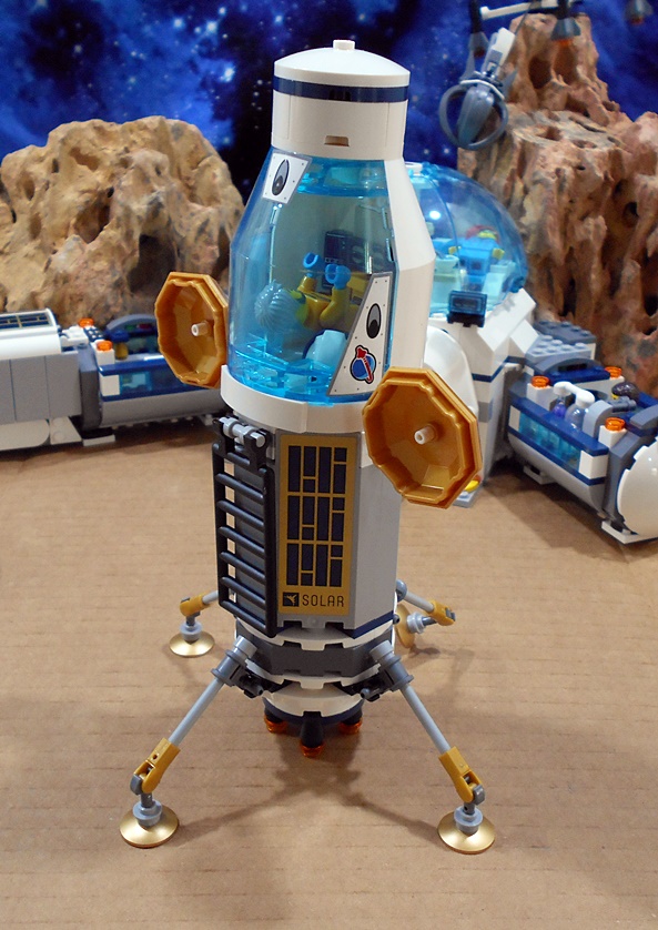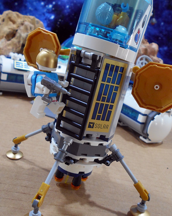 The rocket is a neat build all to itself, and an awesome bonus for this set. It has a one man cockpit, a ladder for getting in and out, two gold dishes, which I assume are for communications. Maybe it can be used to relay messages from the Research Base back to Earth. When you pick up the Rocket to blast off, a transparent flame piece emerges from the thruster cone and the landing legs fold up, which is pretty clever. The sides of the rocket have four gold foil solar panel stickers.