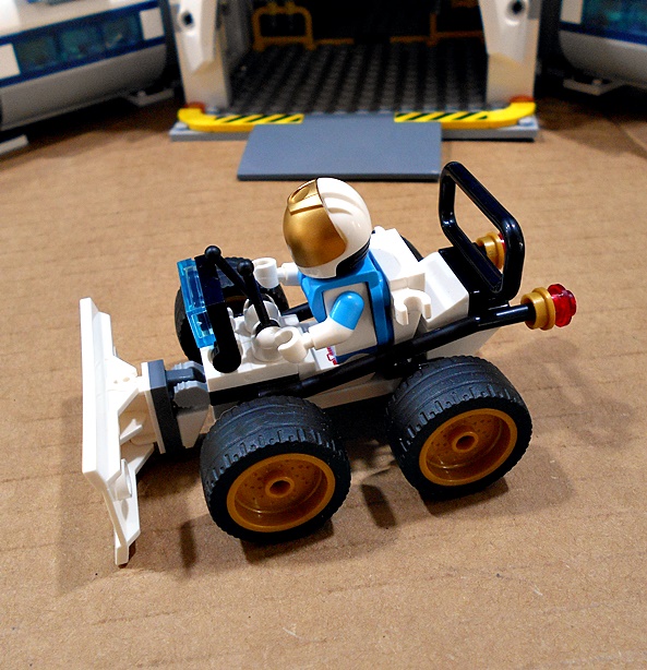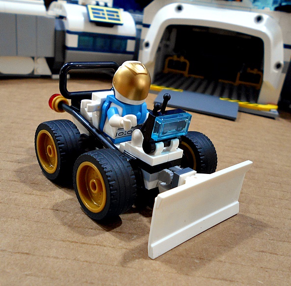 Next up is the Lunar dozer, which seats one Minifig. It’s a sporty little work vehicle with four big wheels, a dozer blade on the front, a little blue lightbar, red tail lights, and some lever controls for the driver. The blade is on front is hinged to angle it up and down. The dozer comes in handy for pushing around rocks or cleaning up the dig site! I love the look of this little crater-hopper and it looks like it would be fun to go off-roading around the Kepler Crater with it.