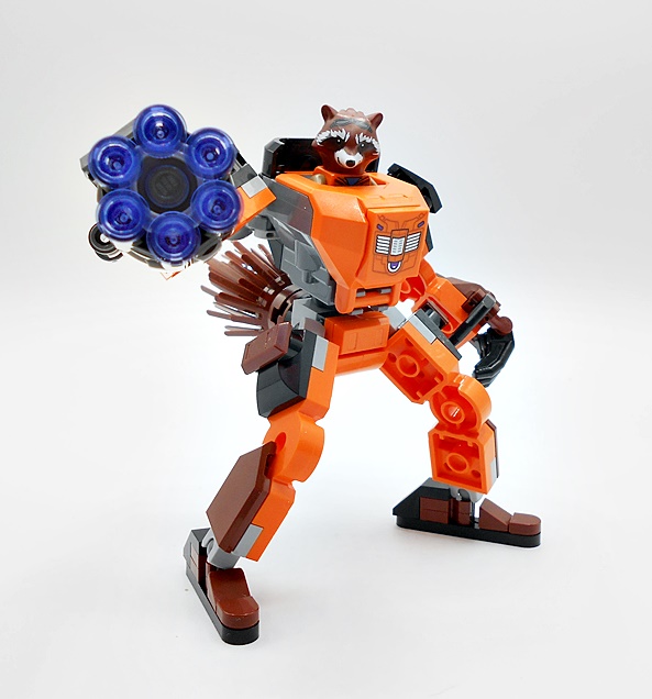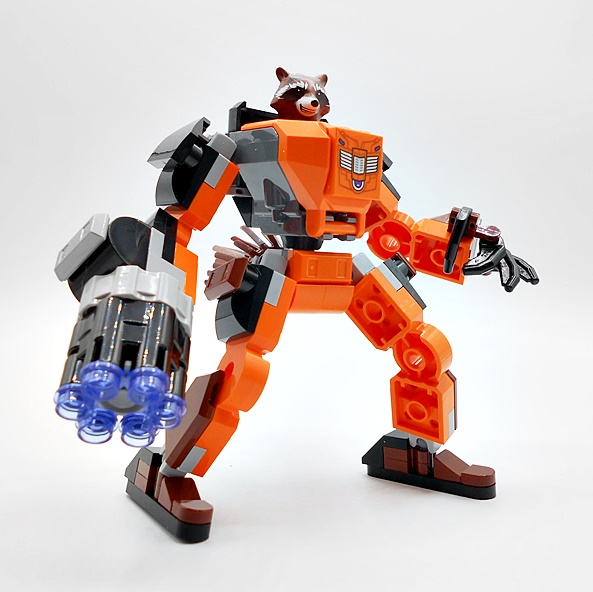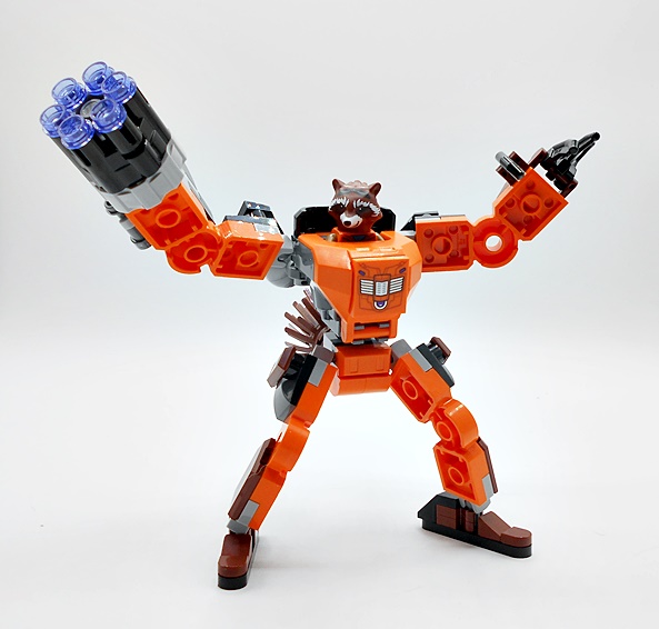 And then there’s the Mech Suit, which I absolutely adore. The chest hinges down to reveal the cockpit for the Minifig to stand in. It would have been cool to put in some of those control sticks pieces, but you just have to use your imagination that he’s controlling it. The chest hinges closed leaving just Rocket’s head peeking out of the Suit.