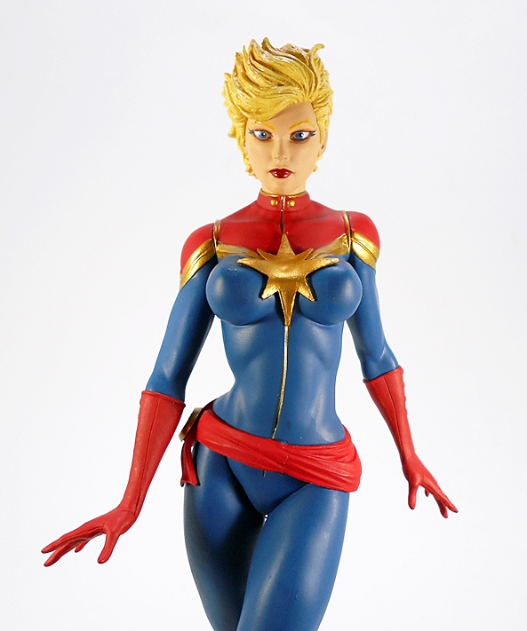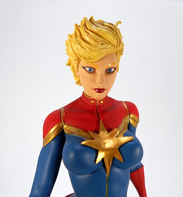 Of course, this is a pretty modern look for Domino, which really just means that her traditional black cat suit is enhanced with a lot more detail and a more tactical look to it. And while we already have a Domino for the films and I wouldn’t take any of that away from the glorious Zazie Beetz, I do think that this version of Domino has a realistic quality to her, which would have worked fine for the big screen. The bulk of the suit is a delightful mix of black and blue, which comes out beautifully under the studio lights, and is enhanced with patches of exposed ribbed blue “material,” presumably to add a little flexibility. Again, it’s all sculpted, but I have no quarrel with the decision because the end results are quite spectacular. Everything from the zipper track to the stitch lines, and the subtle wrinkles here and there make for a very convincing garment, even if it is all polyresin.