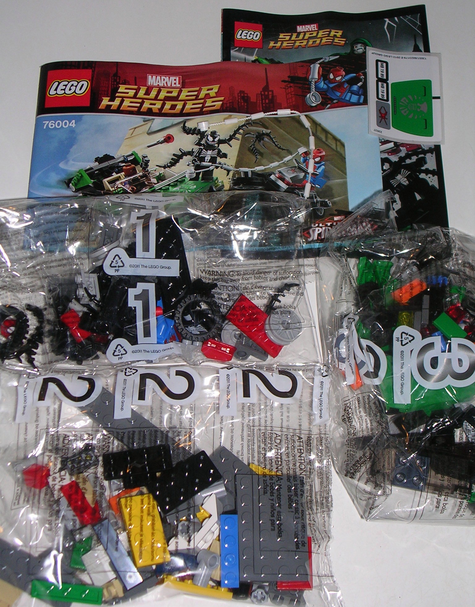 The set comes in a long, narrow box with the Marvel Super Heroes branding. It contains three numbered bags, containing 358 pieces, including a loose base plate. You also get a sticker sheet, two instruction manuals, and a small box containing Strange’s Cloak of Levitation. When you’re all done with the build, you get three Minifigs and the Sanctum Sanctorum playset. Let’s start with the Minifigs!