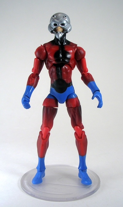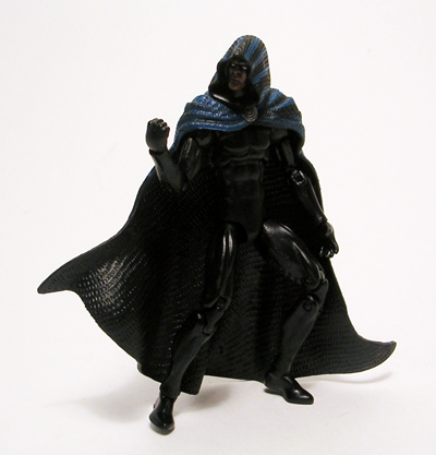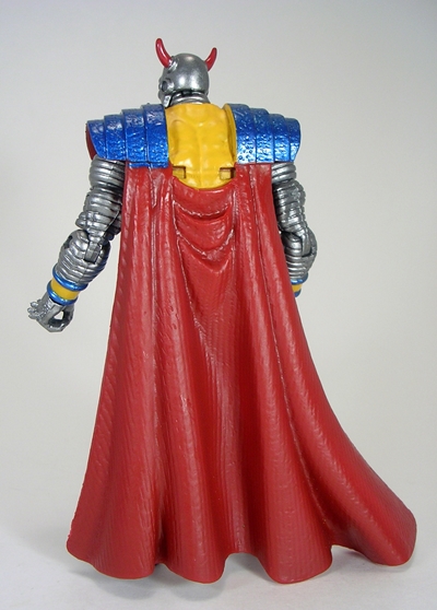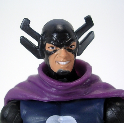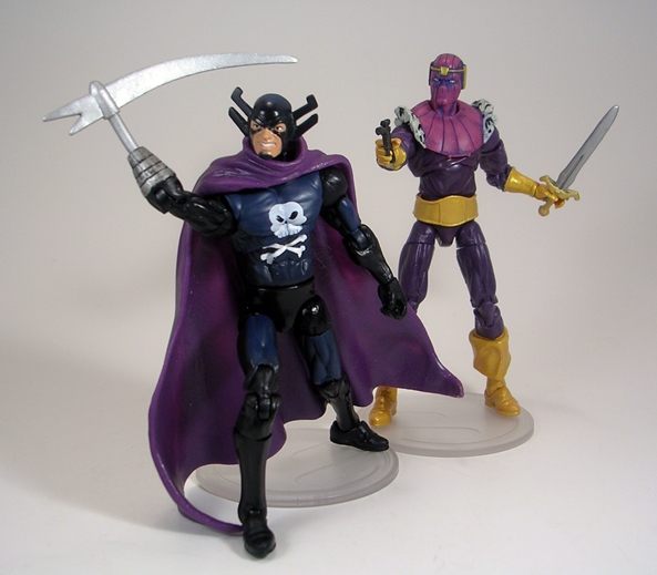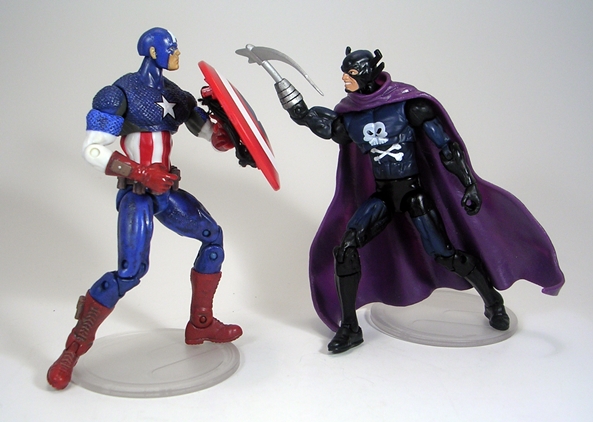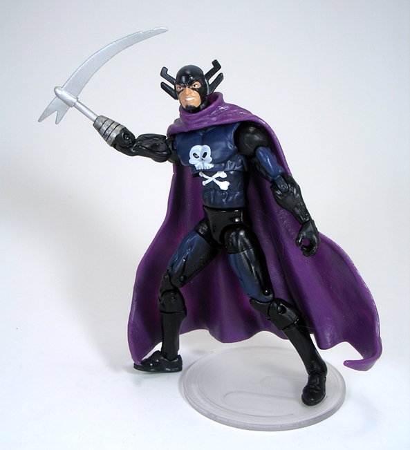 Grim Reaper uses a fairly lean buck and relies mostly on paintwork for his costume. The color scheme uses a subtle mix of black and dark blue to give him that great old school comic book style deco. The white skull and crossbones painted on his chest is a bit uneven in the shading, but overall not too bad. The purple cape is sculpted to sweep away from the figure’s legs and it doesn’t reach down to the ground. Both features help to not to inhibit the leg articulation.