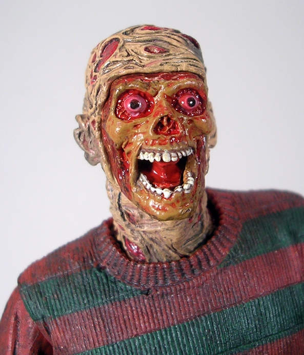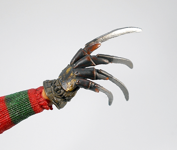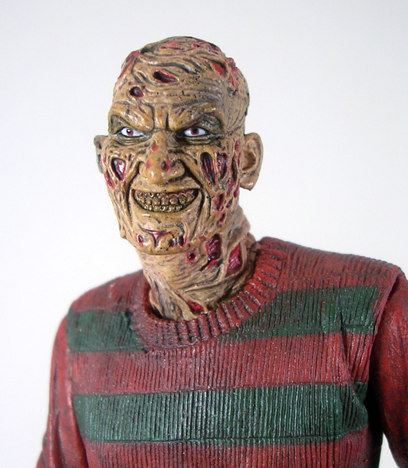 FvJ gave us what is probably the most haggard looking Jason yet, and that’s not surprising since the film opens with Jason being resurrected by Freddy. And I’m not talking a simple lightning bolt to the corpse, I’m talking full on re-constitution or organs and shit. He’s still plenty buffed out, but much of his clothes are practically rotting off of him. Here, Jason eschews his familiar rugged outdoorsman garb for a blue shirt under a badly tattered gray shirt, under a rotting jacket. The attention to detail in the jacket alone is worthy of praise, with all sorts of rips and tears sculpted in and a dirty paint wash to accentuate it. From the waist down, Jason’s duds have fared a little better. There isn’t a whole lot of distress showing on his black trousers or his thick-soled Herman Munster boots. The articulation consists of all the usual rotating hinges we’ve seen in past Jasons, so he’s not overly agile, but there are plenty of useful points here to make him a lot of fun.
