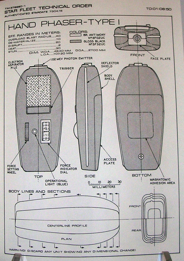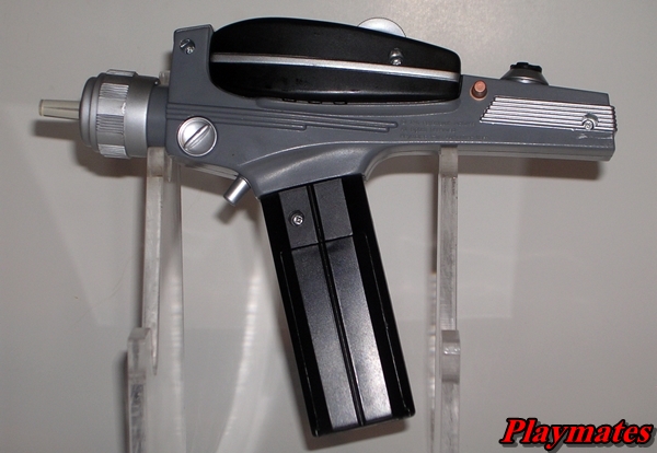 While this Phaser is a bit on the chunky side, I think it still scales fairly well in my adult hand, and most of those chonks are located in the handle, which is odd since this is at least posing as a toy for kids. I think the two-tone gray and black look good, although I’m more fond of the darker gunmetal gray seen on some of the props. The silver bits feature a very nice quality matte paint, which sort of passes for steel. The profile of the weapon is pretty solid, and it isn’t until I sit it next to a more accurate reproduction that I can see the differences, so that’s a good thing. Sadly, the Type-I Phaser on top is not detachable, but I wasn’t expecting it to be since it was fixed in place on the 90’s release as well. The Dilithium Crystal Cell (that silver disk on the side) is used to turn the toy off and on or set it in the limited function Demo mode. Probably the most disappointing thing here is the plethora of screw holes scattered about the left side of the weapon. As we’ll see in a bit, it’s actually worse than the 90’s release, which is rather baffling to me. It’s a shame they couldn’t plug these up.