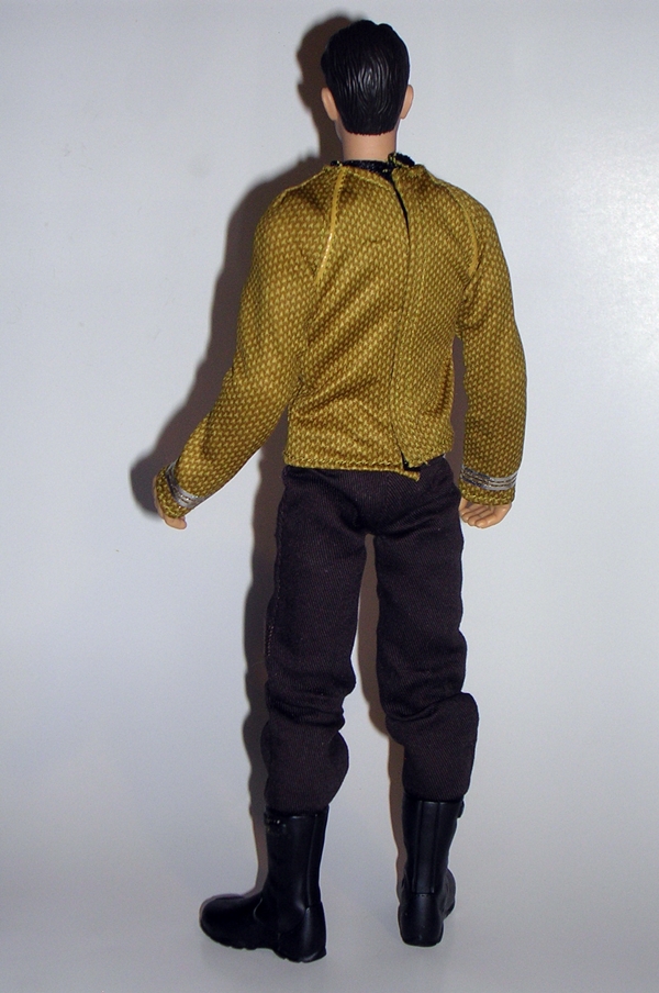 The figure’s outfit is also fairly well executed. The new Starfleet shirts have a complex texture of tiny Starfleet emblems running throughout. Playmates managed to capture this effect with a simple pattern. It’s not quite screen accurate, but it looks good and I applaud them for making the effort, rather than just going what would have looked more like a Classic Series shirt. I’m happy to see that the stripes on the sleeves and the Starfleet emblem on the chest are both sewn on, rather than stickered as Playmates has done in the past. The shirt is a little long in the sleeves, and it’s rather unsightly in the back where it fastens, but otherwise fits the figure well. The trousers have a sewn pattern on the knees and the boots are simple sculpted rubber and make up the figure’s entire feet.