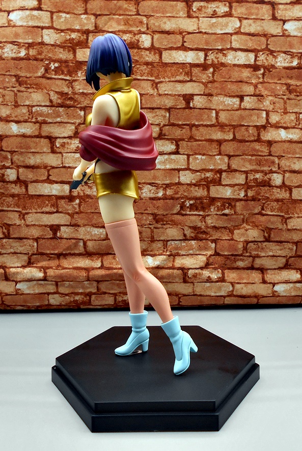 Lilith’s origins are a bit too complex for me to get into here, but she’s sometimes referred to as Morrigan’s half-sister, albeit by way of mystical means. She is often represented as a manifestation of Morrigan’s lost innocence, so she’s portrayed more cute than voluptuous, making for a nice contrast when the two characters are displayed together. I’d classify the pose here as museum-style mixed with a little attitude, as Lilith has her hands resting on her hips, which makes me feel like she’s judging me. The coloring on this figure is excellent with the blue leggings having the darker blue bat patterns, the sleeves being slightly more purple, and a gorgeous high gloss crimson finish on her boots and one-piece. There’s some sculpted white fur that leaves her shoulders bare and a white diamond in the center of her chest. The deco is so vibrant and she pops so beautifully on the shelf.