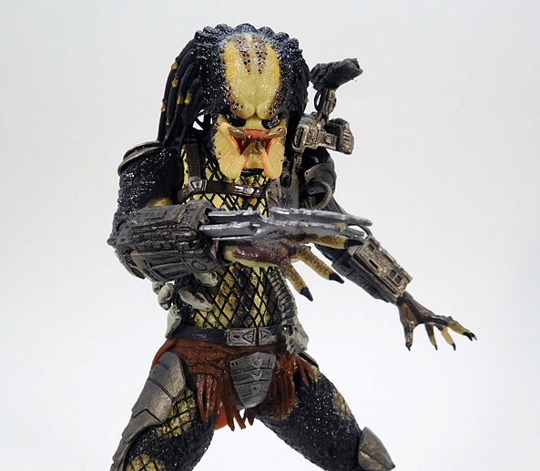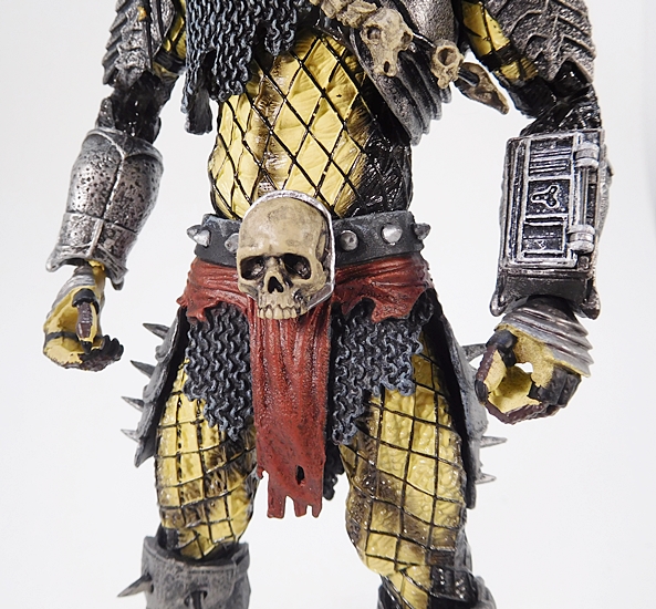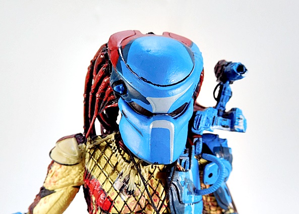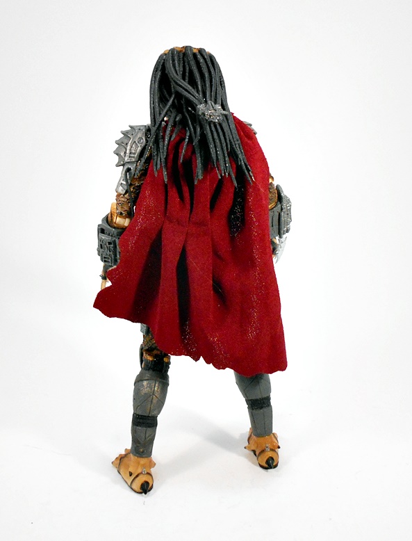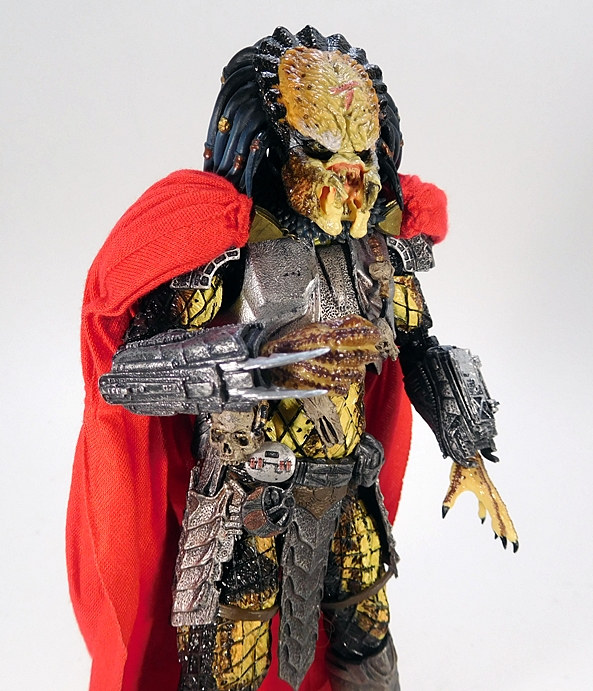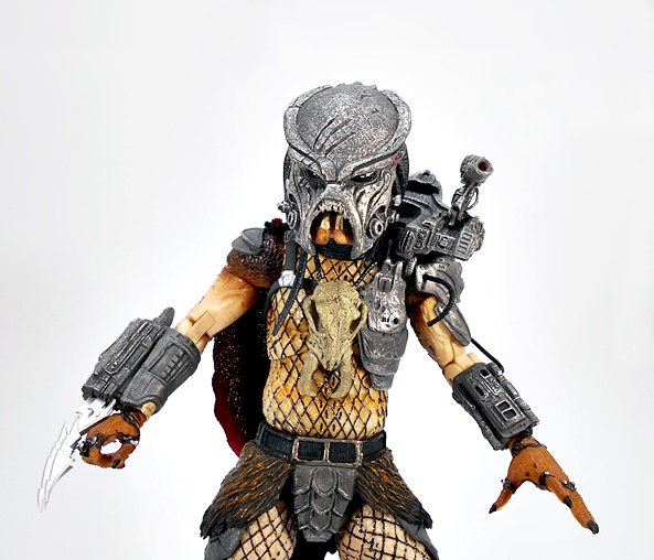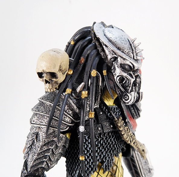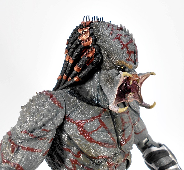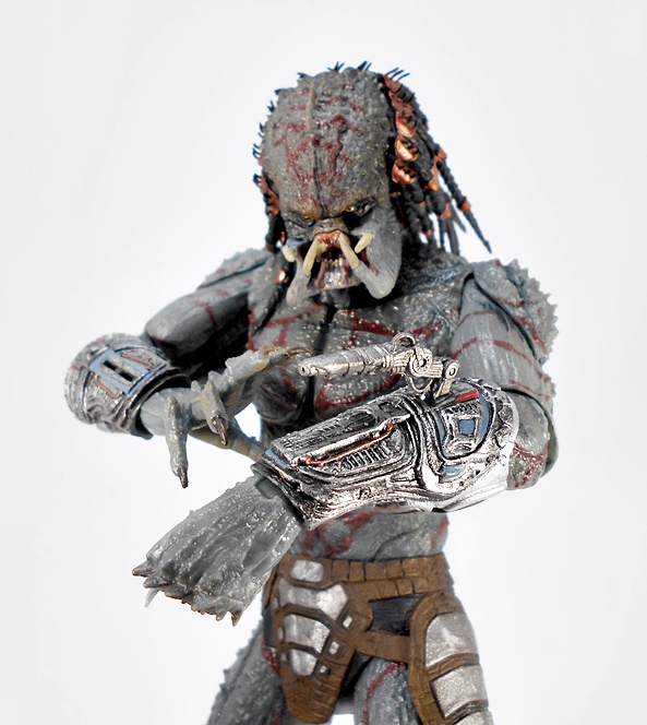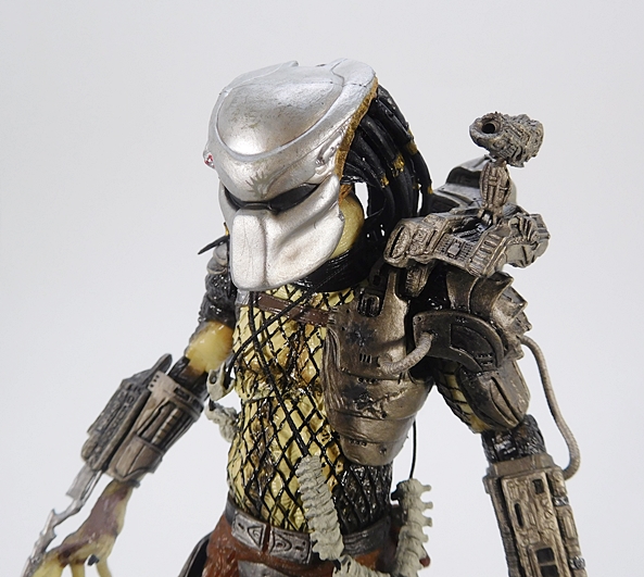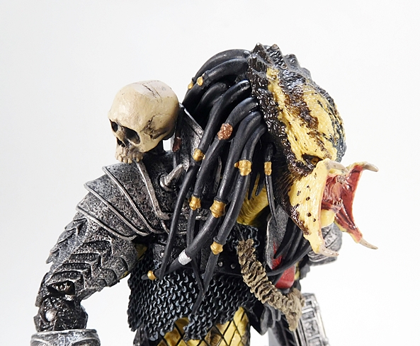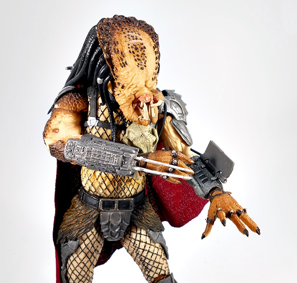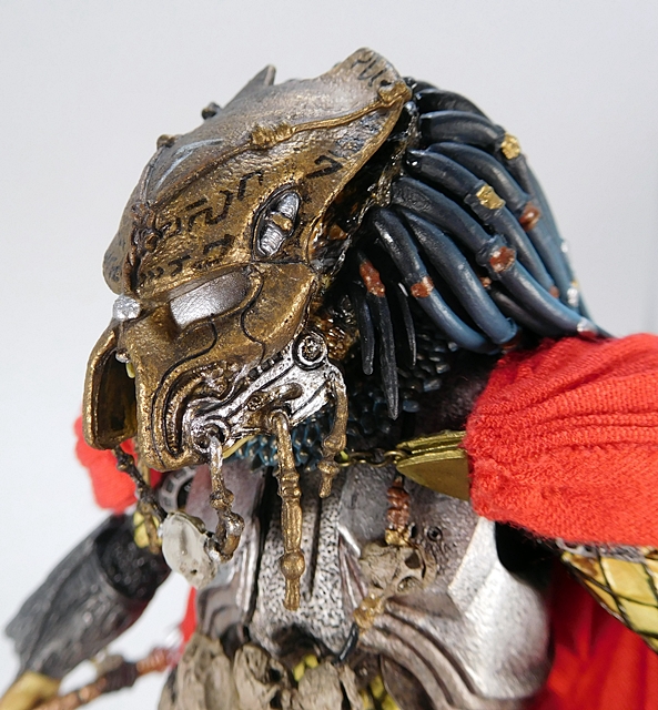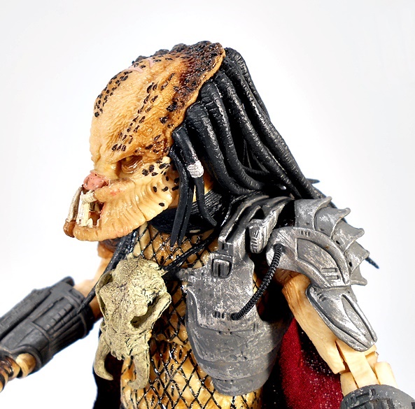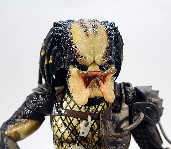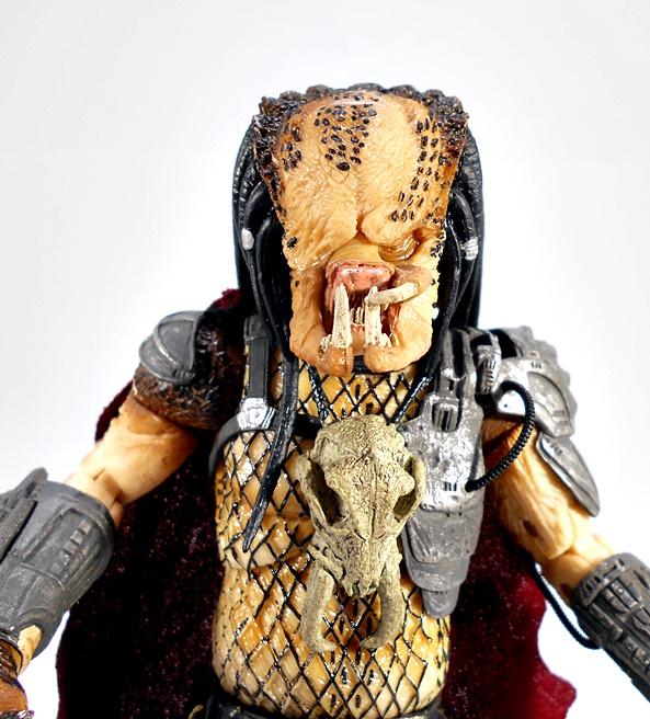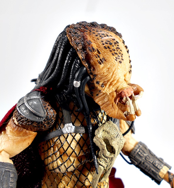 His portrait is no slouch either! Like any Yautja, he’s got a face only a mother would love. The purple skin is still prevalent here, and it really makes those teeth at the end of his mandibles, and the spikes around his cranium, stand out. He’s got one deep set piercing eyeball, and his other has been replaced with an artificial targeting system,nesting in a mess of grafted golden tech. A nest of brown dreadlocks spill out the back of his head, each one with a sculpted gold band. By now, NECA are pros at sculpting the uniquely hideous Predator head, and like the all the others, this one is just a marvel of tiny detail.