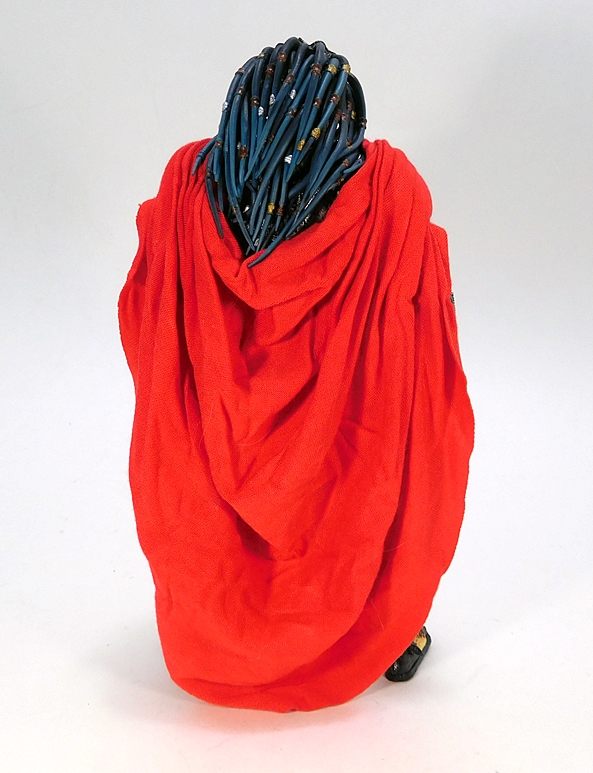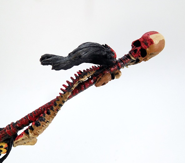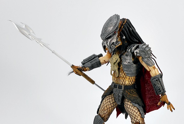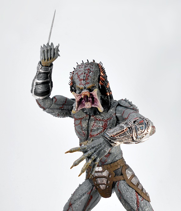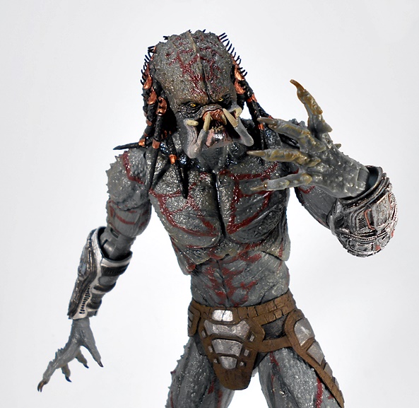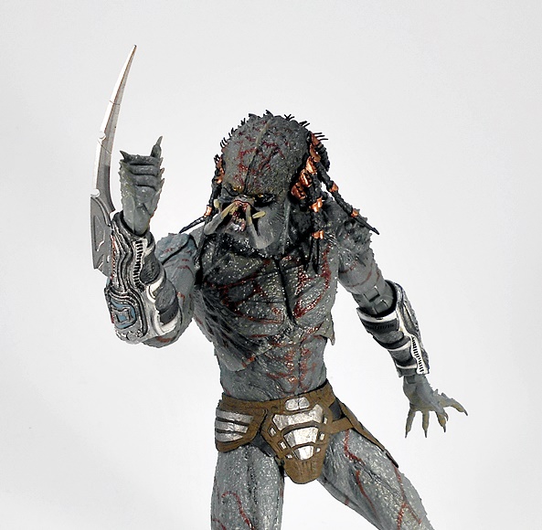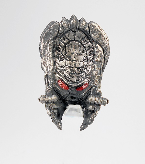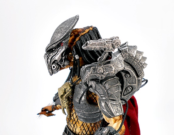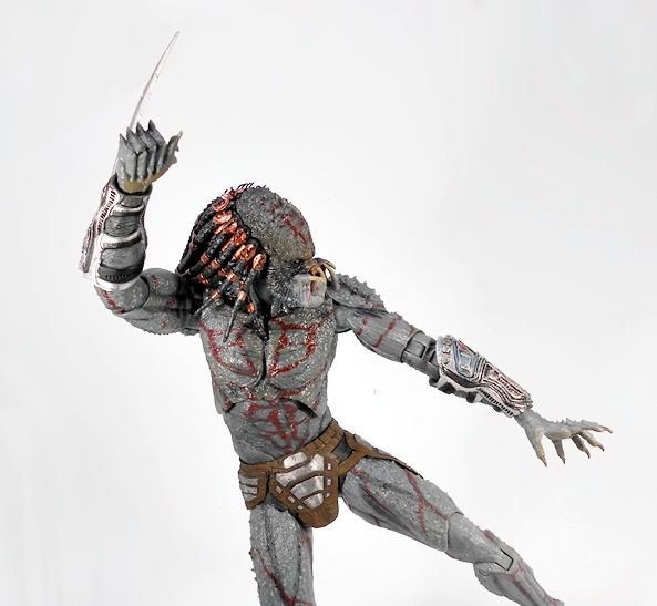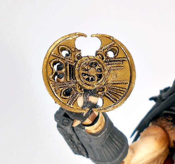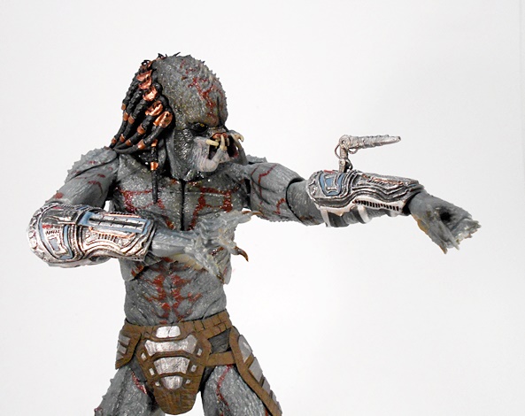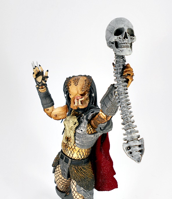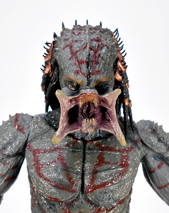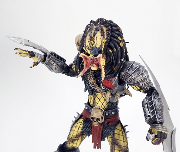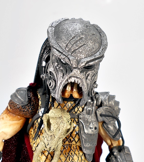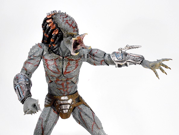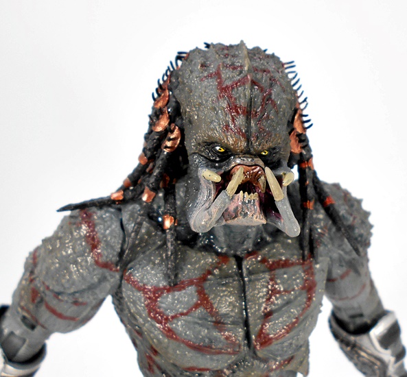 His portrait is no slouch either! Like any Yautja, he’s got a face only a mother would love. The purple skin is still prevalent here, and it really makes those teeth at the end of his mandibles, and the spikes around his cranium, stand out. He’s got one deep set piercing eyeball, and his other has been replaced with an artificial targeting system,nesting in a mess of grafted golden tech. A nest of brown dreadlocks spill out the back of his head, each one with a sculpted gold band. By now, NECA are pros at sculpting the uniquely hideous Predator head, and like the all the others, this one is just a marvel of tiny detail.